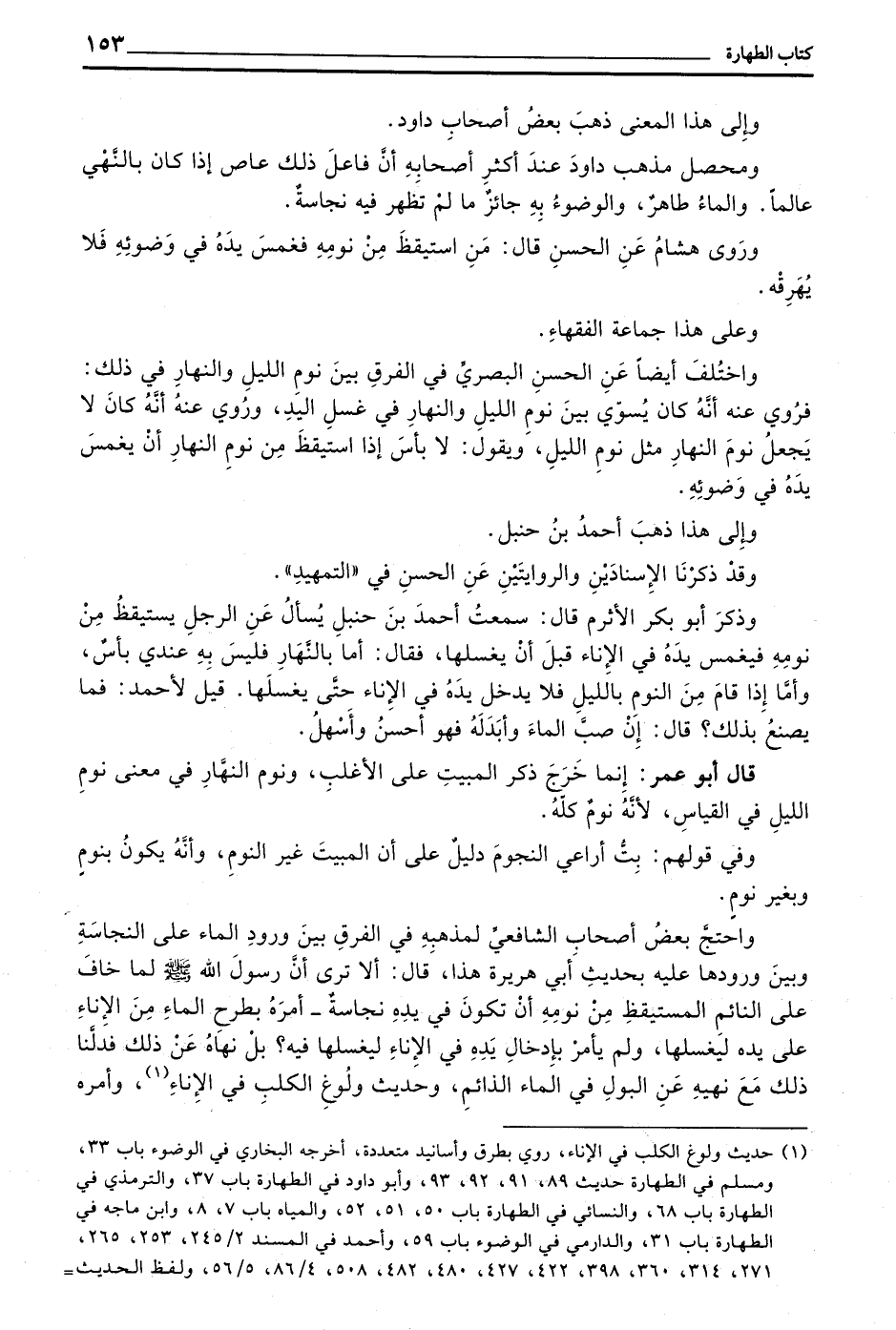 وَاخْتُلِفَ أَيْضًا عَنِ الْحَسَنِ الْبَصْرِيِّ فِي الْفَرْقِ بَيْنَ نَوْمِ اللَّيْلِ وَالنَّهَارِ فِي ذَلِكَ فَرُوِيَ عَنْهُ أَنَّهُ كَانَ يُسَوِّي بَيْنَ نَوْمِ اللَّيْلِ وَالنَّهَارِ فِي غَسْلِ الْيَدِ وَرُوِيَ عَنْهُ أَنَّهُ كَانَ لَا يَجْعَلُ نَوْمَ النَّهَارِ مِثْلَ نَوْمٍ اللَّيْلِ وَيَقُولُ لَا بَأْسَ إِذَا اسْتَيْقَظَ مِنْ نَوْمِ النَّهَارِ أَنْ يَغْمِسَ يَدَهُ فِي وَضُوئِهِ