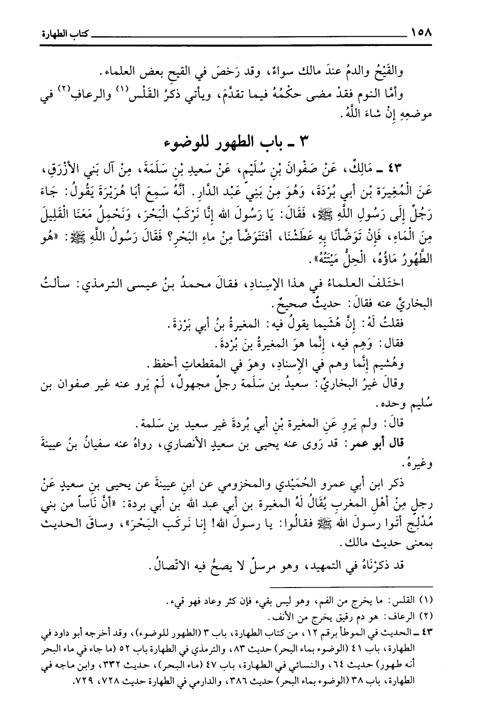 43 - مَالِكٌ عَنْ صَفْوَانَ بْنِ سُلَيْمٍ عَنْ سَعِيدِ بْنِ سَلَمَةَ مِنْ آلِ بَنِي الْأَزْرَقِ عَنِ الْمُغِيرَةِ بْنِ أَبِي بُرْدَةَ وَهُوَ مِنْ بَنِي عَبْدِ الدَّارِ أَنَّهُ سَمِعَ أَبَا هُرَيْرَةَ يَقُولُ جَاءَ رَجُلٌ إِلَى رَسُولِ اللَّهِ صَلَّى اللَّهُ عَلَيْهِ وَسَلَّمَ فَقَالَ يَا رَسُولَ اللَّهِ إِنَّا نَرْكَبُ الْبَحْرَ وَنَحْمِلُ مَعَنَا الْقَلِيلَ مِنَ الْمَاءِ فَإِنْ تَوَضَّأْنَا بِهِ عَطِشْنَا أَفَنَتَوَضَّأُ مِنْ مَاءِ الْبَحْرِ فَقَالَ رَسُولُ اللَّهِ صَلَّى اللَّهُ عَلَيْهِ وَسَلَّمَ ((هُوَ الطَّهُورُ مَاؤُهُ الْحِلُّ مَيْتَتُهُ))