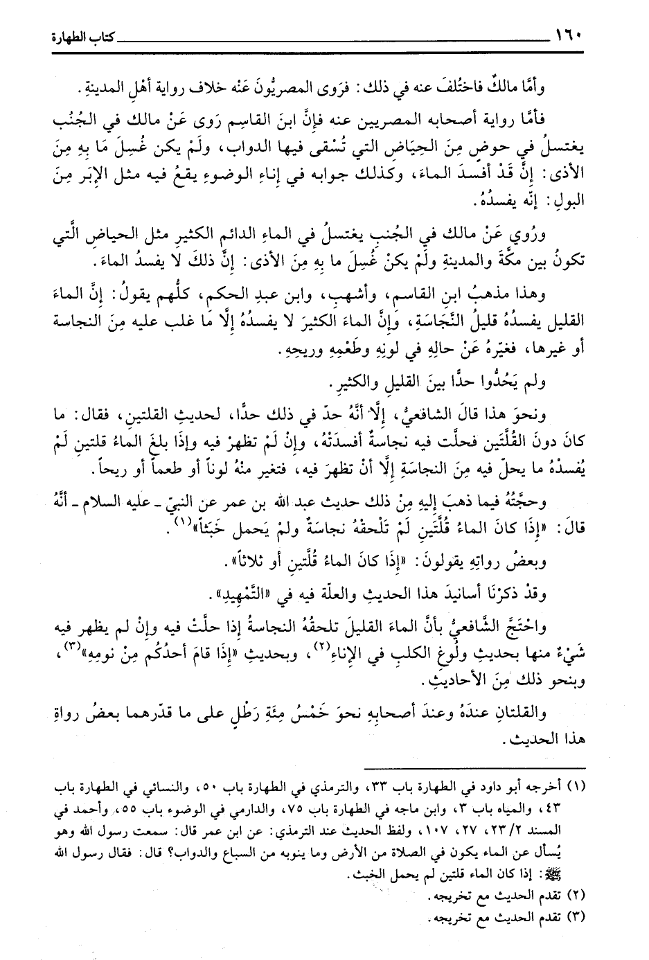 وَحُجَّتُهُ فِيمَا ذَهَبَ إِلَيْهِ مِنْ ذَلِكَ حَدِيثُ عَبْدِ اللَّهِ بْنِ عُمَرَ عَنِ النَّبِيِّ - عَلَيْهِ السَّلَامُ - أَنَّهُ قَالَ ((إِذَا كَانَ الْمَاءُ قُلَّتَيْنِ لَمْ تَلْحَقْهُ نَجَاسَةٌ وَلَمْ يَحْمِلْ خَبَثًا))