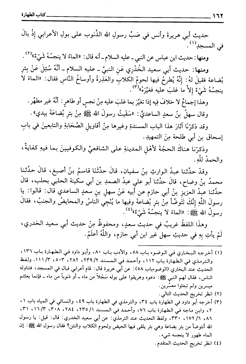 ومنها حديث بْنِ عَبَّاسٍ عَنِ النَّبِيِّ - عَلَيْهِ السَّلَامُ - أَنَّهُ قَالَ ((الْمَاءُ لَا يُنَجِّسُهُ شَيْءٌ))