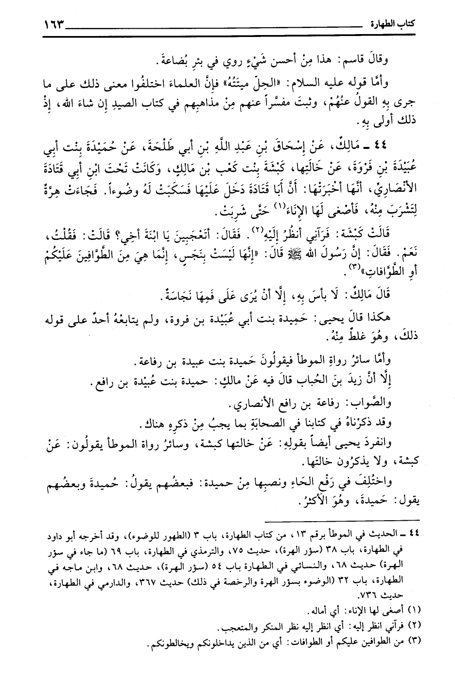 44 - مَالِكٌ عَنْ إِسْحَاقَ بْنِ عَبْدِ اللَّهِ بْنِ أَبِي طَلْحَةَ عَنْ حُمَيْدَةَ بِنْتِ أَبِي عُبَيْدَةَ بْنِ فَرْوَةَ عَنْ خَالَتِهَا كَبْشَةَ بنت كعب بن مالك وكانت تحت بن أَبِي قَتَادَةَ الْأَنْصَارِيِّ أَنَّهَا أَخْبَرَتْهَا أَنَّ أَبَا قَتَادَةَ دَخَلَ عَلَيْهَا فَسَكَبَتْ لَهُ وَضُوءًا فَجَاءَتْ هِرَّةٌ لِتَشْرَبَ مِنْهُ فَأَصْغَى لَهَا الْإِنَاءَ حَتَّى شَرِبَتْ