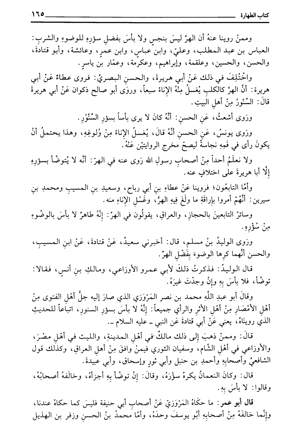 وَمِمَّنْ رُوِّينَا عَنْهُ أَنَّ الْهِرَّ لَيْسَ بِنَجِسٍ وَلَا بَأْسَ بِفَضْلِ سُؤْرِهِ لِلْوُضُوءِ وَالشُّرْبِ الْعَبَّاسُ بن عبد المطلب وعلي وبن عباس وبن عُمَرَ وَعَائِشَةُ وَأَبُو قَتَادَةَ وَالْحَسَنُ وَالْحُسَيْنُ وَعَلْقَمَةُ وَإِبْرَاهِيمُ وَعِكْرِمَةُ وَعَمَّارُ بْنُ يَاسِرٍ