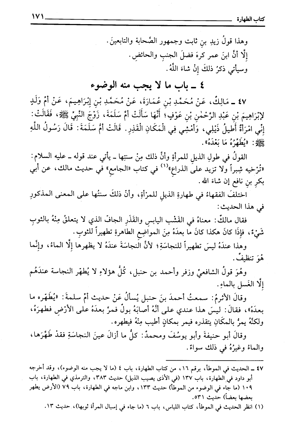 47 - مَالِكٌ عَنْ مُحَمَّدِ بْنِ عُمَارَةَ عَنْ مُحَمَّدِ بْنِ إِبْرَاهِيمَ عَنْ أُمِّ وَلَدٍ لِإِبْرَاهِيمَ بْنِ عَبْدِ الرَّحْمَنِ بْنِ عَوْفٍ أَنَّهَا سَأَلَتْ أُمَّ سَلَمَةَ زَوْجَ النَّبِيِّ صَلَّى اللَّهُ عَلَيْهِ وَسَلَّمَ فَقَالَتْ إِنِّي امْرَأَةٌ أُطِيلُ ذَيْلِي وَأَمْشِي فِي الْمَكَانِ الْقَذِرِ قَالَتْ أُمُّ سَلَمَةَ قَالَ رَسُولُ اللَّهِ صَلَّى اللَّهُ عَلَيْهِ وَسَلَّمَ ((يُطَهِّرُهُ مَا بَعْدَهُ))