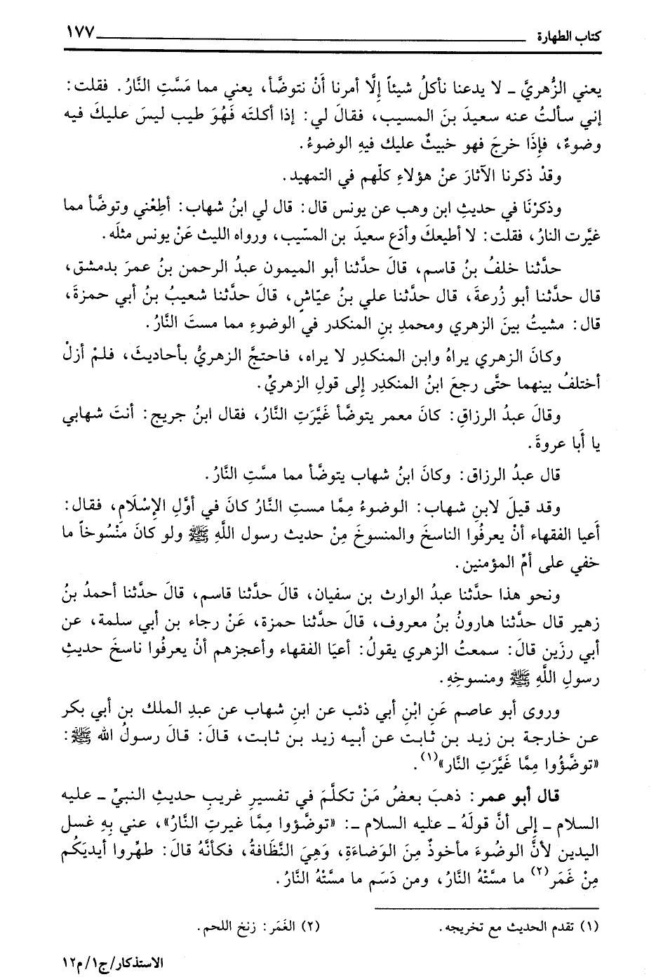 وَقَدْ قِيلَ لِابْنِ شِهَابٍ الْوُضُوءُ مِمَّا مَسَّتِ النَّارُ كَانَ فِي أَوَّلِ الْإِسْلَامِ فَقَالَ أَعْيَا الْفُقَهَاءَ أَنْ يَعْرِفُوا النَّاسِخَ وَالْمَنْسُوخَ مِنْ حَدِيثِ رَسُولِ اللَّهِ صَلَّى اللَّهُ عَلَيْهِ وَسَلَّمَ وَلَوْ كَانَ مَنْسُوخًا مَا خَفِيَ عَلَى أُمِّ الْمُؤْمِنِينَ