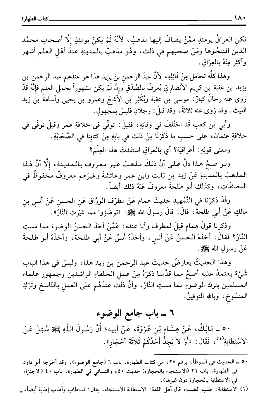 50 - مَالِكٌ عَنْ هِشَامِ بْنِ عُرْوَةَ عَنْ أَبِيهِ أَنَّ رَسُولَ اللَّهِ صَلَّى اللَّهُ عَلَيْهِ وَسَلَّمَ سُئِلَ عَنْ الِاسْتِطَابَةِ فَقَالَ ((أَوَ لَا يَجِدُ أَحَدُكُمْ ثَلَاثَةَ أحجار