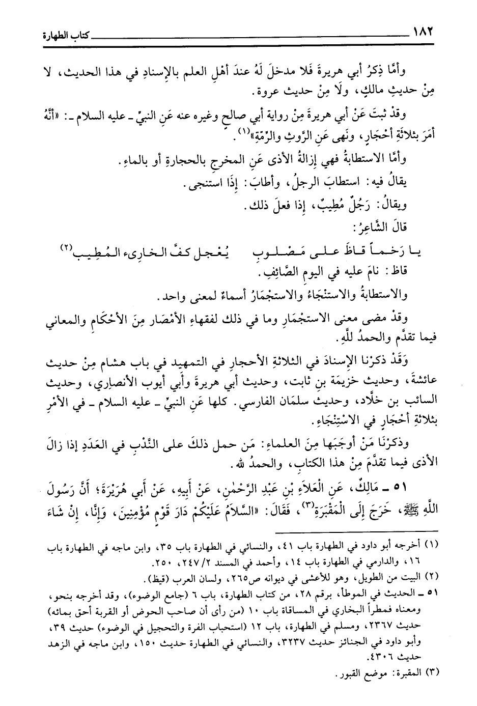 وَقَدْ ذَكَرْنَا الْإِسْنَادَ فِي الثَّلَاثَةِ الْأَحْجَارِ فِي التَّمْهِيدِ فِي بَابِ هِشَامٍ مِنْ حَدِيثِ عَائِشَةَ وَحَدِيثِ خُزَيْمَةَ بْنِ ثَابِتٍ وَحَدِيثِ أَبِي هُرَيْرَةَ وَأَبِي أَيُّوبَ الْأَنْصَارِيِّ وَحَدِيثِ السَّائِبِ بْنِ خَلَّادٍ وَحَدِيثِ سَلْمَانَ الْفَارِسِيِّ كُلُّهَا عَنِ النَّبِيِّ - عَلَيْهِ السَّلَامُ - فِي الْأَمْرِ بِثَلَاثَةِ أَحْجَارٍ فِي الِاسْتِنْجَاءِ