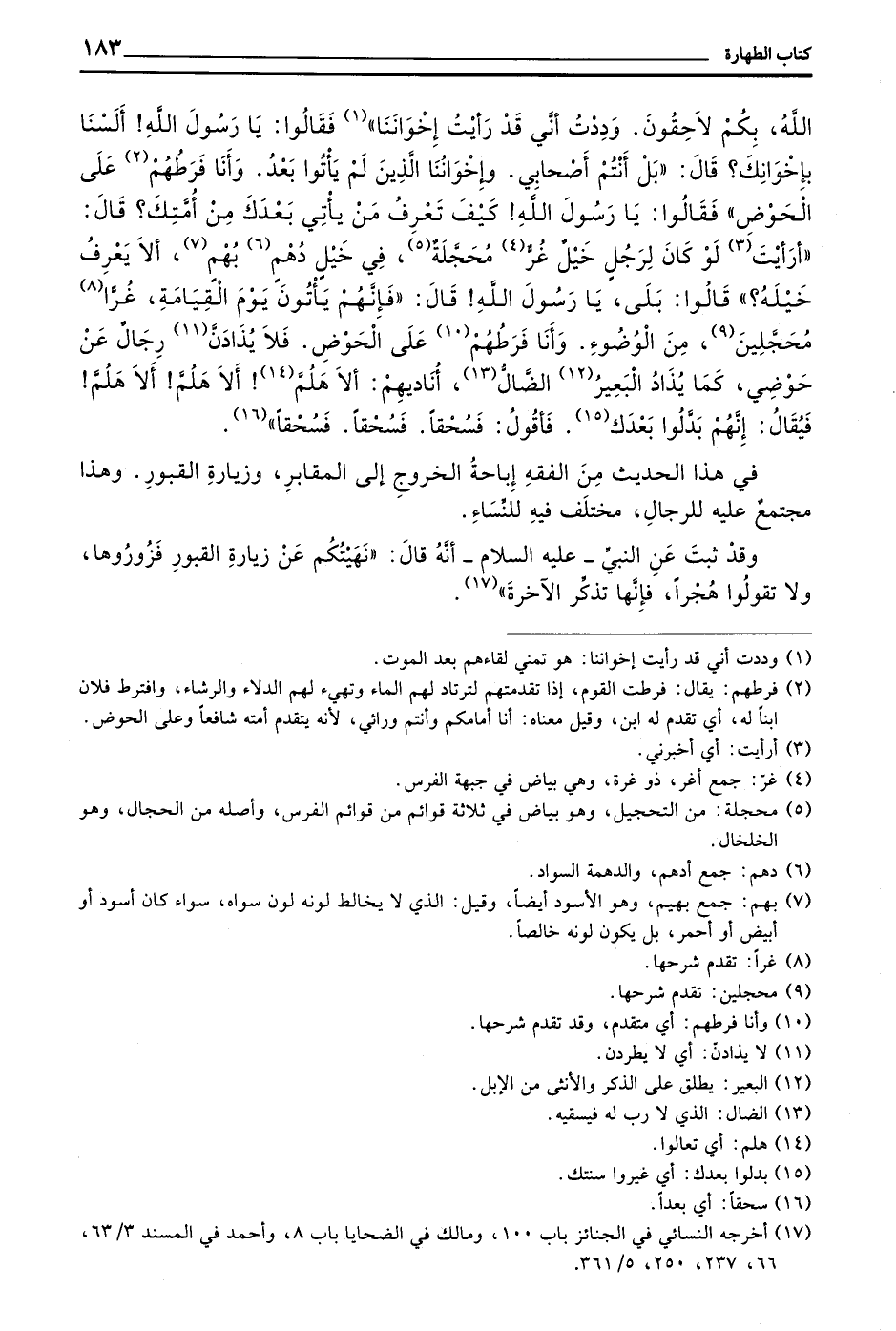 اللَّهُ بِكُمْ لَاحِقُونَ وَدِدْتُ أَنِّي قَدْ رَأَيْتُ إِخْوَانَنَا)) فَقَالُوا يَا رَسُولَ اللَّهِ! أَلَسْنَا بِإِخْوَانِكَ قَالَ ((بَلْ أَنْتُمْ أَصْحَابِي وَإِخْوَانُنَا الَّذِينَ لَمْ يَأْتُوا بَعْدُ وَأَنَا فَرَطُهُمْ (2) عَلَى الْحَوْضِ)) فَقَالُوا يَا رَسُولَ اللَّهِ! كَيْفَ تَعْرِفُ مَنْ يَأْتِي بَعْدَكَ مِنْ أُمَّتِكَ قَالَ ((أَرَأَيْتَ (3) لَوْ كَانَ لِرَجُلٍ خَيْلٌ غُرٌ مُحَجَّلَةٌ فِي خَيْلٍ دُهْمٍ بُهْمٍ أَلَا يَعْرِفَ خَيْلَهُ)) قَالُوا بَلَى يَا رَسُولَ اللَّهِ! قَالَ ((فَإِنَّهُمْ يَأْتُونَ يَوْمَ الْقِيَامَةِ غُرًّا (8) مُحَجَّلِينَ مِنَ الْوُضُوءِ وَأَنَا فَرَطُهُمْ عَلَى الْحَوْضِ فَلَا يُذَادَنَّ رِجَالٌ عَنْ حَوْضِي كَمَا يُذَادُ الْبَعِيرُ الضَّالُّ أُنَادِيهِمْ أَلَا هَلُمَّ! أَلَا هَلُمَّ! أَلَا هَلُمَّ! فَيُقَالُ إِنَّهُمْ بَدَّلُوا بِعْدَكَ فَأَقُولُ فَسُحْقًا فَسُحْقًا فَسُحْقًا))