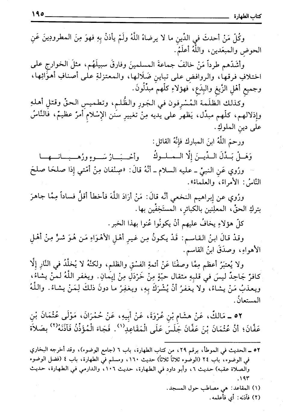 52 - مَالِكٌ عَنْ هِشَامِ بْنِ عُرْوَةَ عَنْ أَبِيهِ عن حمران مَوْلَى عُثْمَانَ بْنِ عَفَّانَ أَنَّ عُثْمَانَ بْنَ عَفَّانَ جَلَسَ عَلَى الْمَقَاعِدِ فَجَاءَ الْمُؤَذِّنُ فَآذَنَهُ بصلاة