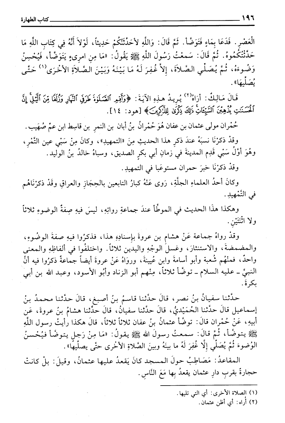 حَدَّثَنَا سُفْيَانُ بْنُ نَصْرٍ قَالَ حَدَّثَنَا قَاسِمُ بْنُ أَصْبَغَ قَالَ حَدَّثَنَا مُحَمَّدُ بْنُ إِسْمَاعِيلَ قَالَ حَدَّثَنَا الْحُمَيْدِيُّ قَالَ حَدَّثَنَا سُفْيَانُ قَالَ حَدَّثْنَا هِشَامُ بْنُ عُرْوَةَ عَنْ أَبِيهِ عَنْ حُمْرَانَ قَالَ تَوَضَّأَ عُثْمَانُ بْنُ عَفَّانَ ثَلَاثًا ثَلَاثًا قَالَ هَكَذَا رَأَيْتُ رَسُولَ اللَّهِ صَلَّى اللَّهُ عَلَيْهِ وَسَلَّمَ يتوضأ ثُمَّ قَالَ سَمِعْتُ رَسُولَ اللَّهِ صَلَّى اللَّهُ عَلَيْهِ وَسَلَّمَ يَقُولُ ((مَا مِنْ رَجُلٍ يَتَوَضَّأُ فَيُحْسِنُ الْوُضُوءَ ثُمَّ يُصَلِّي إِلَّا غُفِرَ لَهُ مَا بَيْنَهُ وَبَيْنَ الصَّلَاةِ الْأُخْرَى حَتَّى يُصَلِّيَهَا))