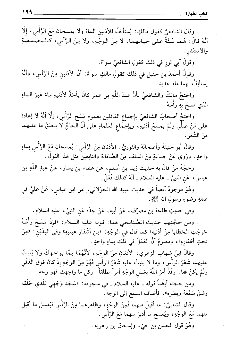 وقال بن شِهَابٍ الزُّهْرِيُّ الْأُذُنَانِ مِنَ الْوَجْهِ لِأَنَّهُمَا مِمَّا يُوَاجِهُكَ وَلَا يَنْبُتُ عَلَيْهِمَا شَعْرُ الرَّأْسِ وَمَا لَا يَنْبُتُ عَلَيْهِ شَعْرُ الرَّأْسِ فَهُوَ مِنَ الْوَجْهِ إِذْ كَانَ فَوْقَ الذَّقَنِ وَلَمْ يَكُنْ قَفَا وَقَدْ أَمَرَ اللَّهُ بِغَسْلِ الْوَجْهِ أَمْرًا مُطْلَقًا وَكُلُّ مَا وَاجَهَكَ فَهُوَ وَجْهٌ