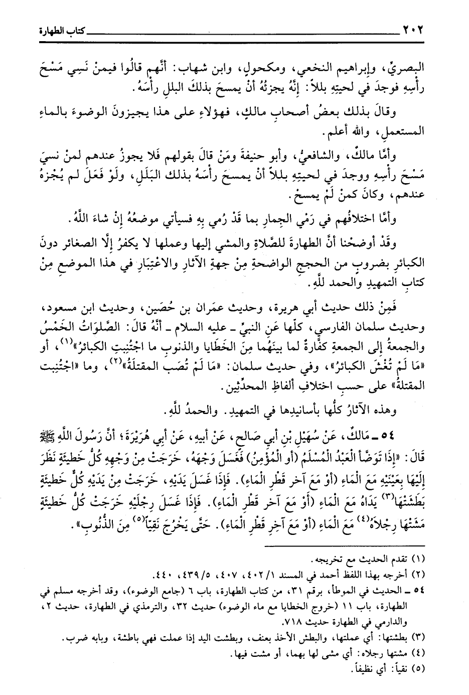 وَقَدْ أَوْضَحْنَا أَنَّ الطَّهَارَةَ لِلصَّلَاةِ وَالْمَشْيَ إِلَيْهَا وَعَمَلَهَا لَا يُكَفِّرُ إِلَّا الصَّغَائِرَ دُونَ الْكَبَائِرِ بِضُرُوبٍ مِنَ الْحُجَجِ الْوَاضِحَةِ مِنْ جِهَةِ الْآثَارِ وَالِاعْتِبَارِ فِي هَذَا الْمَوْضِعِ مِنْ كِتَابِ التَّمْهِيدِ وَالْحَمْدُ لِلَّهِ
