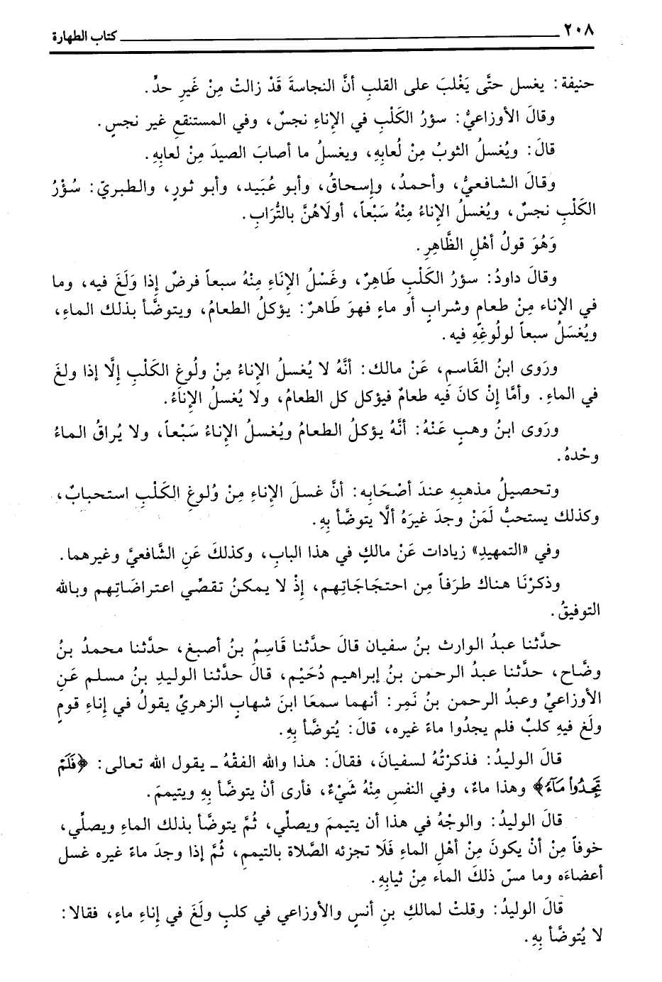 قَالَ الْوَلِيدُ وَقُلْتُ لِمَالِكِ بْنِ أَنَسٍ وَالْأَوْزَاعِيِّ فِي كَلْبٍ وَلَغَ فِي إِنَاءِ مَاءٍ فَقَالَا لَا يُتَوَضَّأُ بِهِ