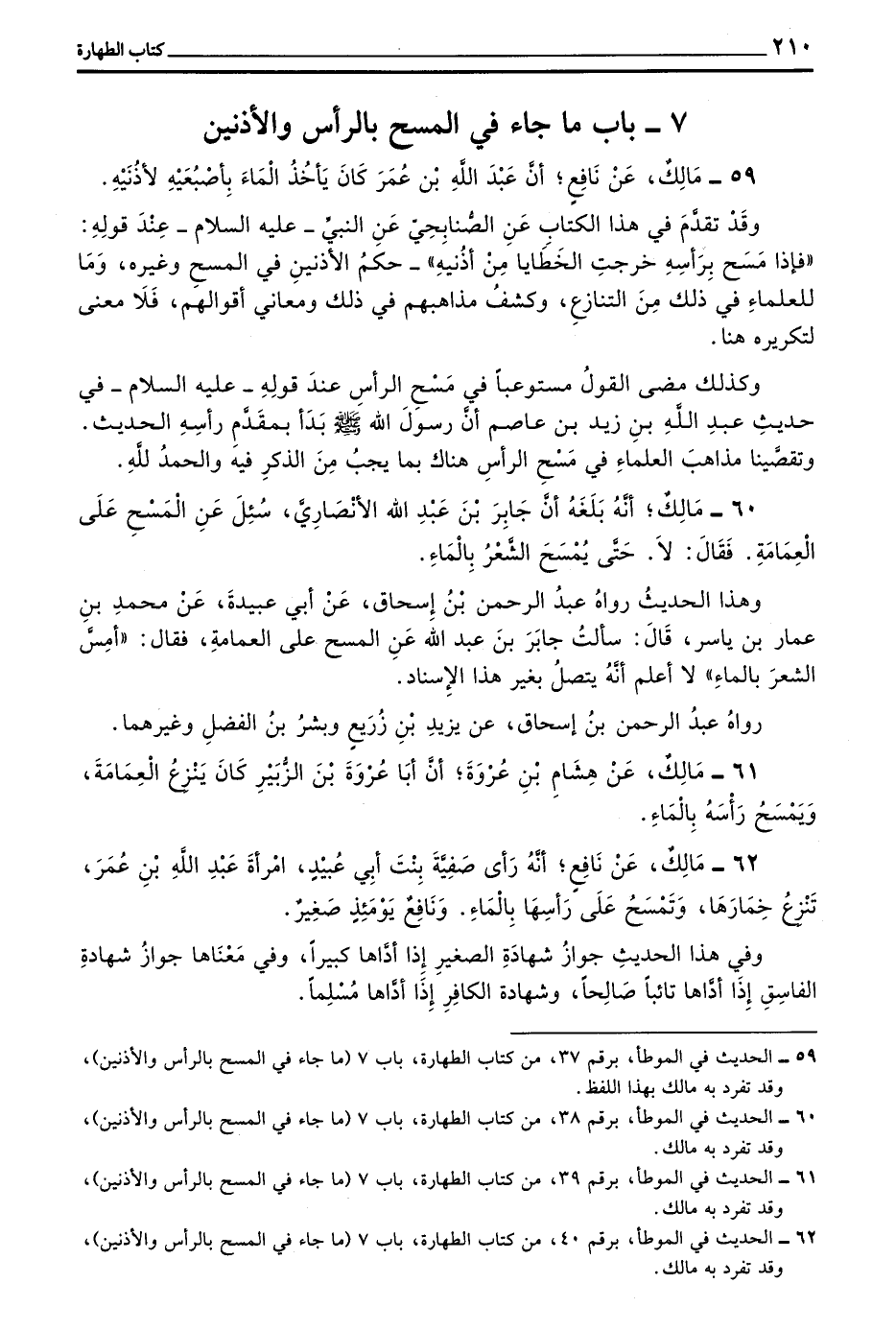 59 - مَالِكٌ عَنْ نَافِعٍ أَنَّ عَبْدَ اللَّهِ بْنَ عُمَرَ كَانَ يَأْخُذُ الْمَاءَ بِإِصْبَعَيْهِ لِأُذُنَيْهِ