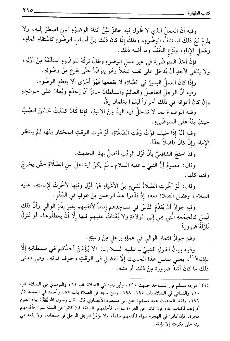 وَفِيهِ بَيَانٌ لِقَوْلِ النَّبِيِّ - عَلَيْهِ السَّلَامُ - ((لَا يُؤَمَّنَّ أَحَدُكُمْ فِي سُلْطَانِهِ إِلَّا بِإِذْنِهِ)) يَعْنِي بِدَلِيلِ هَذَا الْحَدِيثِ إِلَّا لِفَضْلٍ فِي الْوَقْتِ وَخَوْفِ فَوْتِهِ وَفِي مَعْنَى ذَلِكَ مَا كَانَ أَشَدَّ ضَرُورَةً مِنْ ذَلِكَ أَوْ مِثْلَهُ