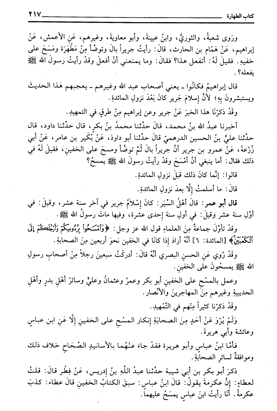 وروى شعبة والثوري وبن عُيَيْنَةَ وَأَبُو مُعَاوِيَةَ وَغَيْرُهُمْ عَنِ الْأَعْمَشِ عَنْ إِبْرَاهِيمَ عَنْ هَمَّامِ بْنِ الْحَارِثِ قَالَ رَأَيْتُ جَرِيرًا بَالَ وَتَوَضَّأَ مِنْ مَطْهَرَةٍ وَمَسَحَ عَلَى خُفَّيْهِ فَقِيلَ لَهُ أَتَفْعَلُ هَذَا فَقَالَ وَمَا يَمْنَعُنِي أَنْ أَفْعَلَ وَقَدْ رَأَيْتُ رَسُولَ اللَّهِ صَلَّى اللَّهُ عَلَيْهِ وَسَلَّمَ يَفْعَلُهُ