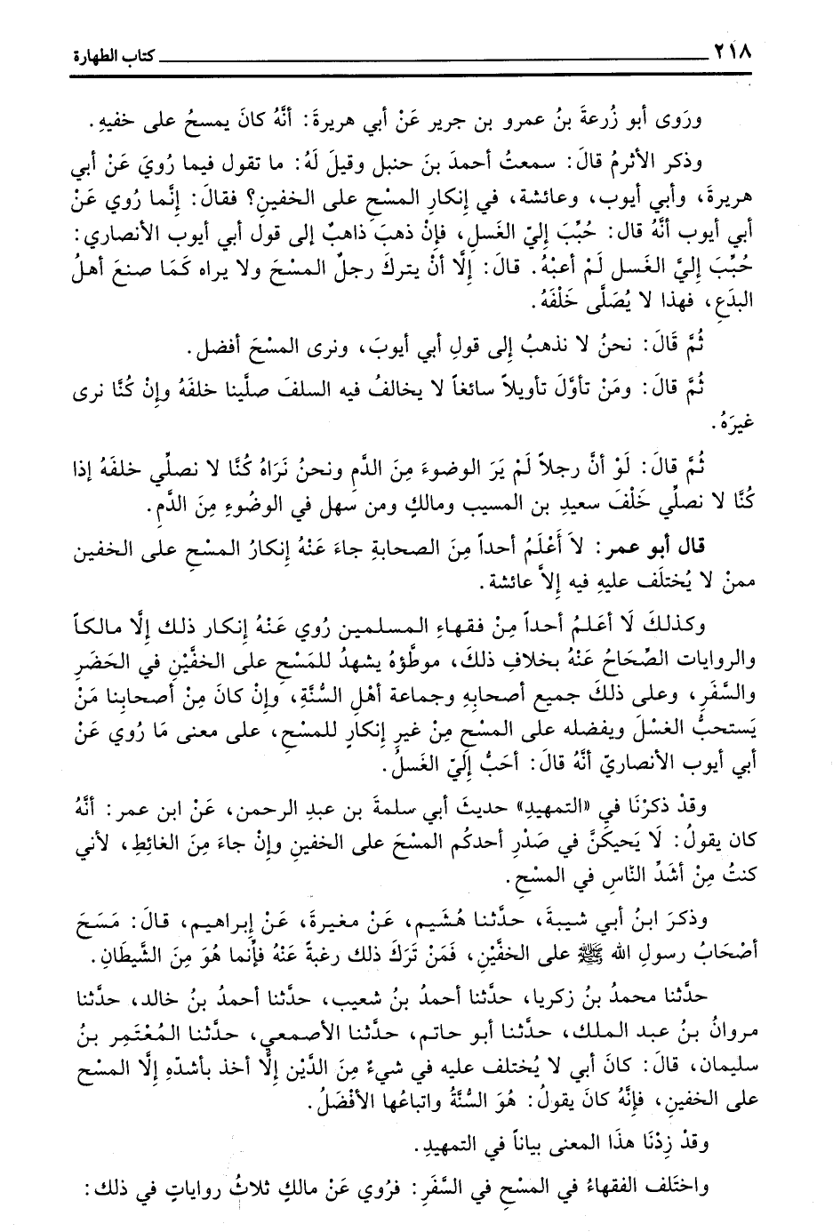 وَكَذَلِكَ لَا أَعْلَمُ أَحَدًا مِنْ فُقَهَاءِ الْمُسْلِمِينَ رُوِيَ عَنْهُ إِنْكَارُ ذَلِكَ إِلَّا مَالِكًا وَالرِّوَايَاتُ الصِّحَاحُ عَنْهُ بِخِلَافِ ذَلِكَ مُوَطَّؤُهُ يَشْهَدُ لِلْمَسْحِ عَلَى الْخُفَّيْنِ فِي الْحَضَرِ وَالسَّفَرِ وَعَلَى ذَلِكَ جَمِيعُ أَصْحَابِهِ وَجَمَاعَةُ أَهْلِ السُّنَّةِ وَإِنْ كَانَ مِنْ أَصْحَابِنَا مَنْ يَسْتَحِبُّ الْغَسْلَ وَيُفَضِّلُهُ عَلَى الْمَسْحِ مِنْ غَيْرِ إِنْكَارٍ لِلْمَسْحِ عَلَى مَعْنَى مَا رُوِيَ عَنْ أَبِي أَيُّوبَ الْأَنْصَارِيِّ أَنَّهُ قَالَ أَحَبُّ إِلَيَّ الْغَسْلُ