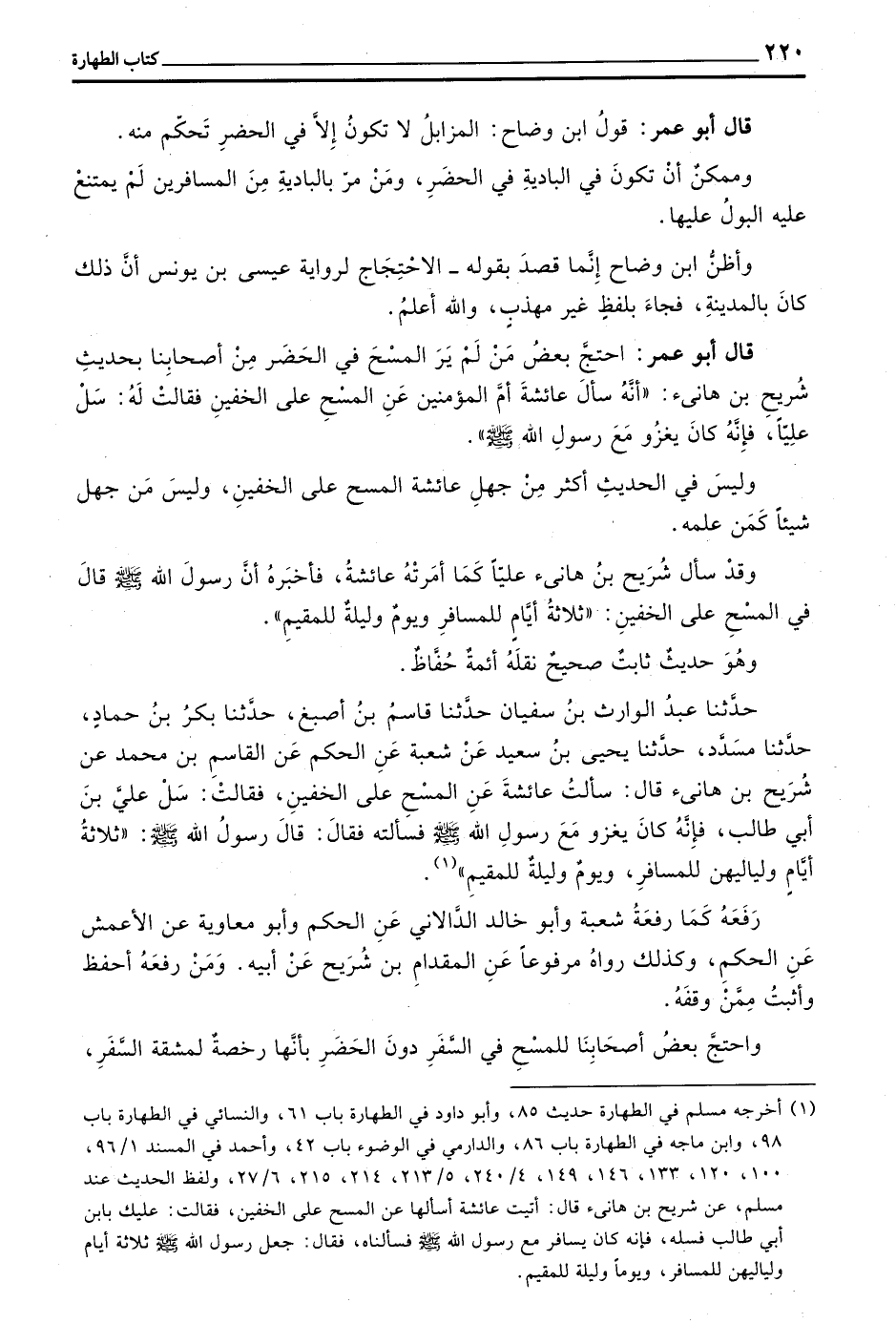 قَالَ أَبُو عُمَرَ احْتَجَّ بَعْضُ مَنْ لَمْ يَرَ الْمَسْحَ فِي الْحَضَرِ مِنْ أَصْحَابِنَا بِحَدِيثِ شُرَيْحِ بْنِ هَانِئٍ ((أَنَّهُ سَأَلَ عَائِشَةَ أُمَّ الْمُؤْمِنِينَ عَنِ الْمَسْحِ عَلَى الْخُفَّيْنِ فَقَالَتْ لَهُ سَلْ عَلِيًّا فَإِنَّهُ كَانَ يَغْزُو مَعَ رَسُولِ اللَّهِ صَلَّى اللَّهُ عَلَيْهِ وَسَلَّمَ))