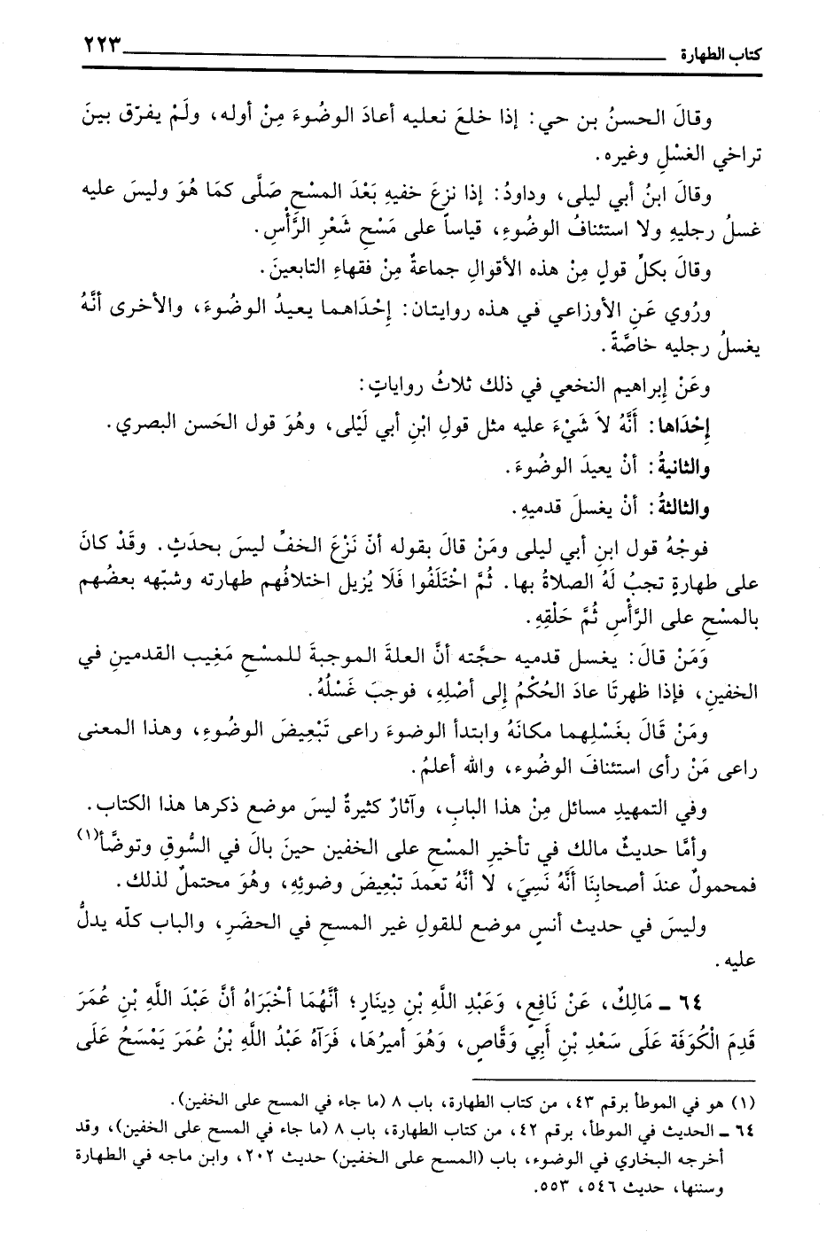 64 - مَالِكٌ عَنْ نَافِعٍ وَعَبْدِ اللَّهِ بْنِ دِينَارٍ أَنَّهُمَا أَخْبَرَاهُ أَنَّ عَبْدَ اللَّهِ بْنَ عُمَرَ قَدِمَ الْكُوفَةَ عَلَى سَعْدِ بْنِ أَبِي وَقَّاصٍ وَهُوَ أَمِيرُهَا فَرَآهُ عَبْدُ اللَّهِ بْنُ عُمَرَ يَمْسَحُ عَلَى