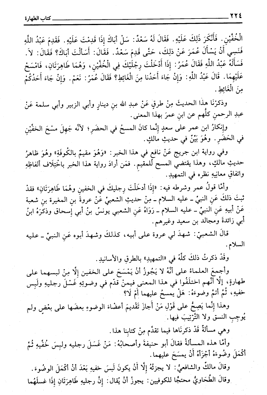 الْخُفَّيْنِ فَأَنْكَرَ ذَلِكَ عَلَيْهِ فَقَالَ لَهُ سَعْدٌ سَلْ أَبَاكَ إِذَا قَدِمْتَ عَلَيْهِ فَقَدِمَ عَبْدُ اللَّهِ فَنَسِيَ أَنْ يَسْأَلَ عُمَرَ عَنْ ذَلِكَ حَتَّى قَدِمَ سَعْدٌ فَقَالَ أَسَأَلْتَ أَبَاكَ فَقَالَ لَا فَسَأَلَهُ عَبْدُ اللَّهِ فَقَالَ عُمَرُ إِذَا أَدْخَلْتَ رِجْلَيْكَ فِي الْخُفَّيْنِ وَهُمَا طَاهِرَتَانِ فَامْسَحْ عَلَيْهِمَا قَالَ عَبْدُ اللَّهِ وَإِنْ جَاءَ أَحَدُنَا مِنَ الْغَائِطِ فَقَالَ عُمَرُ نَعَمْ وَإِنْ جَاءَ أَحَدُكُمْ مِنَ الْغَائِطِ