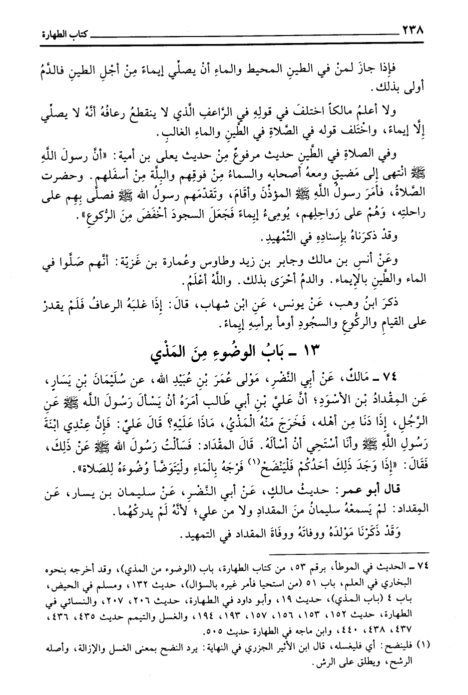 74 - مَالِكٌ عَنْ أَبِي النَّضْرِ مَوْلَى عُمَرَ بْنِ عُبَيْدِ اللَّهِ عَنْ سُلَيْمَانَ بْنِ يَسَارٍ عَنِ الْمِقْدَادِ بْنِ الْأَسْوَدِ أَنَّ عَلِيَّ بْنَ أَبِي طَالِبٍ أَمَرَهُ أَنْ يَسْأَلَ رَسُولَ اللَّهِ صَلَّى اللَّهُ عَلَيْهِ وَسَلَّمَ عَنِ الرَّجُلِ إِذَا دَنَا مِنْ أَهْلِهِ فَخَرَجَ مِنْهُ الْمَذْيُ مَاذَا عَلَيْهِ قَالَ عَلِيٌّ فَإِنَّ عِنْدِي ابْنَةَ رَسُولِ اللَّهِ صَلَّى اللَّهُ عَلَيْهِ وَسَلَّمَ وَأَنَا أَسْتَحِي أَنْ أَسْأَلَهُ قَالَ الْمِقْدَادُ فَسَأَلْتُ رَسُولَ اللَّهِ صَلَّى اللَّهُ عَلَيْهِ وَسَلَّمَ عَنْ ذَلِكَ فَقَالَ ((إِذَا وَجَدَ ذَلِكَ أَحَدُكُمْ فَلْيَنْضَحْ (1) فَرْجَهُ بِالْمَاءِ وَلْيَتَوَضَّأْ وُضُوءَهُ لِلصَّلَاةِ))
