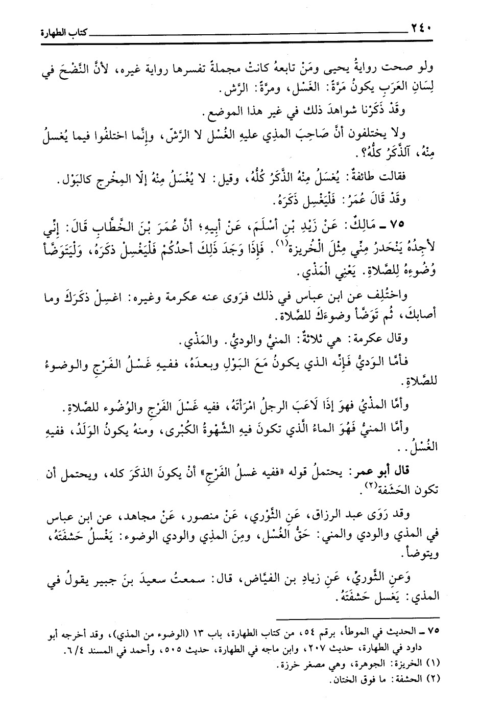75 - مَالِكٌ عَنْ زَيْدِ بْنِ أَسْلَمَ عَنْ أَبِيهِ أَنَّ عُمَرَ بْنَ الْخَطَّابِ قَالَ إِنِّي لَأَجِدُهُ يَنْحَدِرُ مِنِّي مِثْلَ الْخُرَيْزَةِ فَإِذَا وَجَدَ ذَلِكَ أَحَدُكُمْ فَلْيَغْسِلْ ذَكَرَهُ وَلْيَتَوَضَّأْ وُضُوءَهُ لِلصَّلَاةِ يَعْنِي المذي