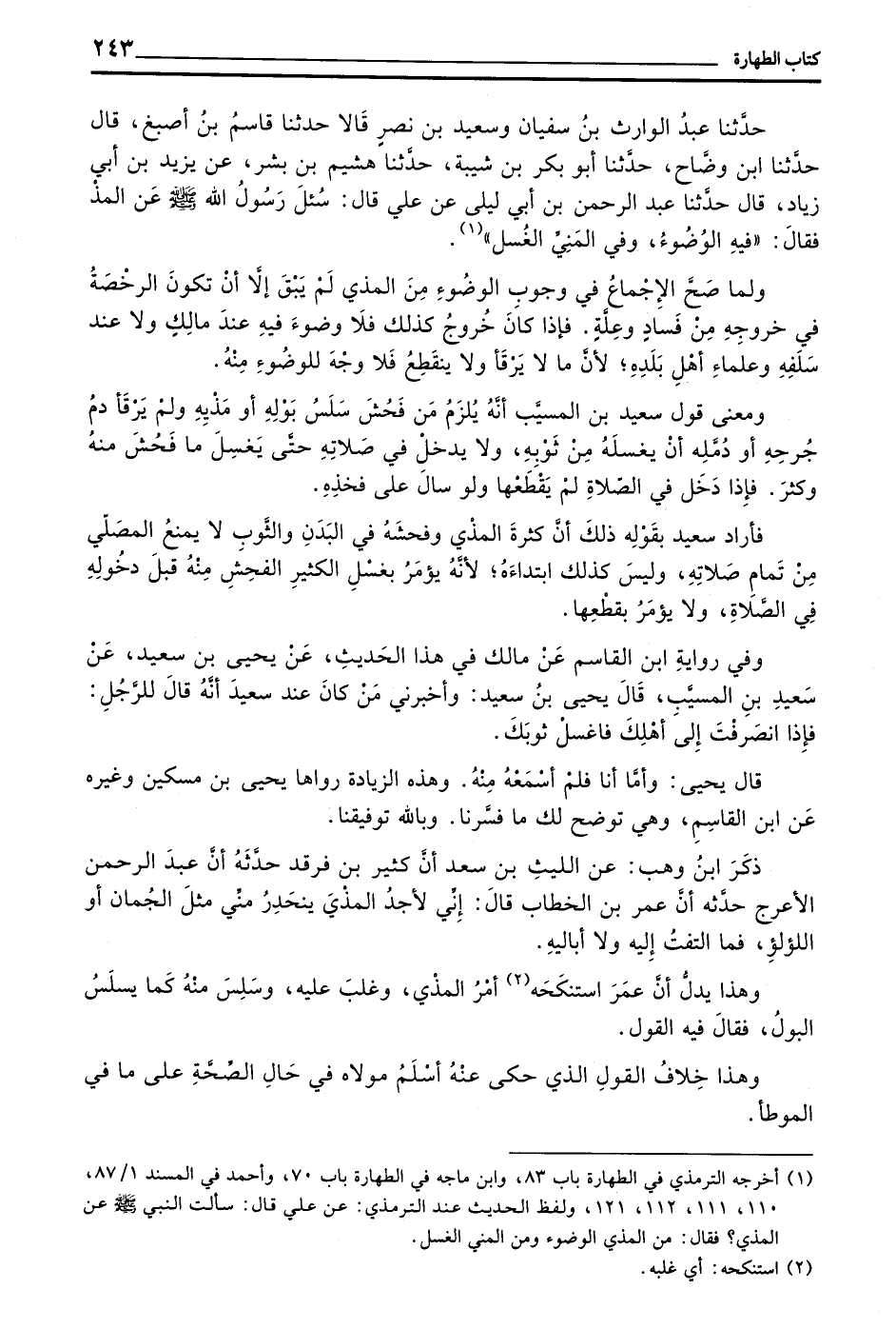 حَدَّثَنَا عَبْدُ الْوَارِثِ بْنُ سُفْيَانَ وَسَعِيدُ بْنُ نَصْرٍ قَالَا حَدَّثَنَا قَاسِمُ بْنُ أَصْبَغَ قَالَ حَدَّثَنَا بن وَضَّاحٍ حَدَّثَنَا أَبُو بَكْرِ بْنُ شَيْبَةَ حَدَّثَنَا هُشَيْمُ بْنُ بِشْرٍ عَنْ يَزِيدَ بْنِ أَبِي زِيَادٍ قَالَ حَدَّثَنَا عَبْدُ الرَّحْمَنِ بْنُ أَبِي لَيْلَى عَنْ عَلِيٍّ قَالَ سُئِلَ رَسُولُ اللَّهِ صَلَّى اللَّهُ عَلَيْهِ وَسَلَّمَ عَنِ الْمَذْيِ فَقَالَ ((فِيهِ الْوُضُوءُ وَفِي الْمَنِيِّ الْغُسْلُ))