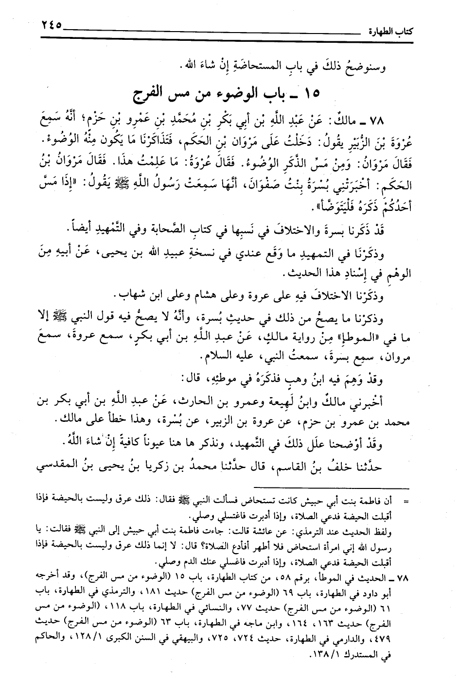 وَذَكَرْنَا مَا يَصِحُّ مِنْ ذَلِكَ فِي حَدِيثِ بُسْرَةَ وَأَنَّهُ لَا يَصِحُّ فِيهِ قَوْلُ النَّبِيِّ صَلَّى اللَّهُ عَلَيْهِ وَسَلَّمَ إِلَّا مَا فِي ((الْمُوَطَّأِ)) مِنْ رِوَايَةِ مَالِكٍ عَنْ عَبْدِ اللَّهِ بْنِ أَبِي بَكْرٍ سَمِعَ عُرْوَةَ سَمِعَ مَرْوَانَ سَمِعَ بُسْرَةَ سَمِعْتُ النَّبِيَّ عَلَيْهِ السَّلَامُ