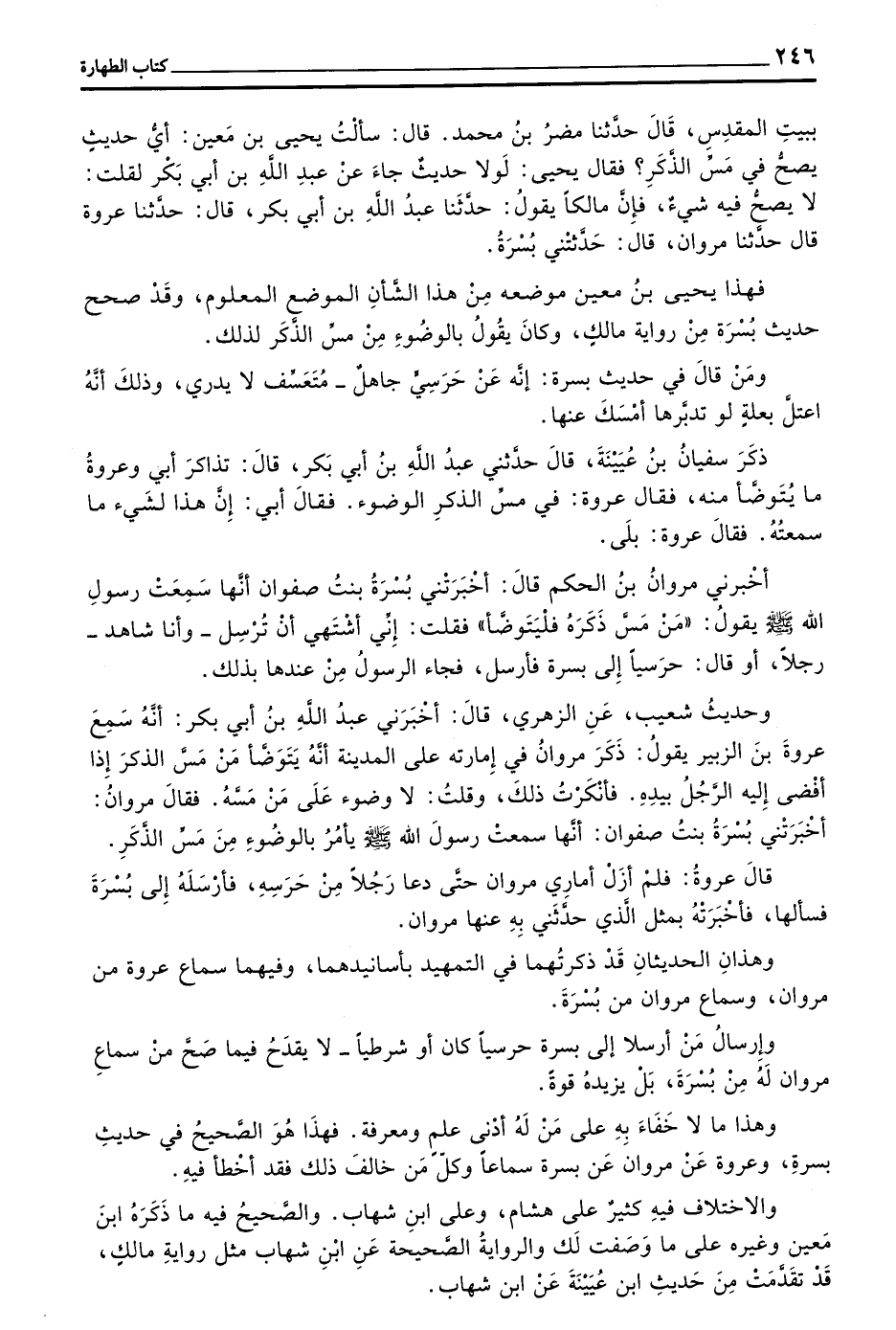 بِبَيْتِ الْمَقْدِسِ قَالَ حَدَّثَنَا مُضَرُ بْنُ مُحَمَّدٍ قَالَ سَأَلْتُ يَحْيَى بْنَ مَعِينٍ أَيُّ حَدِيثٍ يَصِحُّ فِي مَسِّ الذَّكَرِ فَقَالَ يَحْيَى لَوْلَا حَدِيثٌ جَاءَ عَنْ عَبْدِ اللَّهِ بْنِ أَبِي بَكْرٍ لَقُلْتُ لَا يَصِحُّ فِيهِ شَيْءٌ فَإِنَّ مَالِكًا يَقُولُ حَدَّثَنَا عَبْدُ اللَّهِ بْنُ أَبِي بَكْرٍ قَالَ حَدَّثَنَا عُرْوَةُ قَالَ حَدَّثَنَا مَرْوَانُ قَالَ حَدَّثَتْنِي بُسْرَةُ