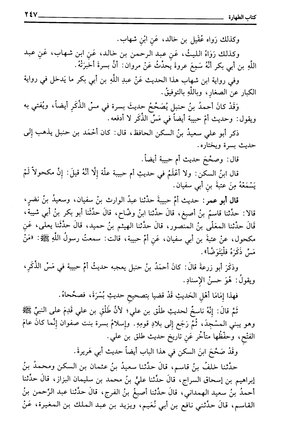 وَقَدْ كَانَ أَحْمَدُ بْنُ حَنْبَلٍ يُصَحِّحُ حَدِيثَ بُسْرَةَ فِي مَسِّ الذَّكَرِ أَيْضًا وَيُفْتِي بِهِ وَيَقُولُ وَحَدِيثُ أُمِّ حَبِيبَةَ أَيْضًا فِي مَسِّ الذَّكَرِ لَا أَدْفَعُهُ