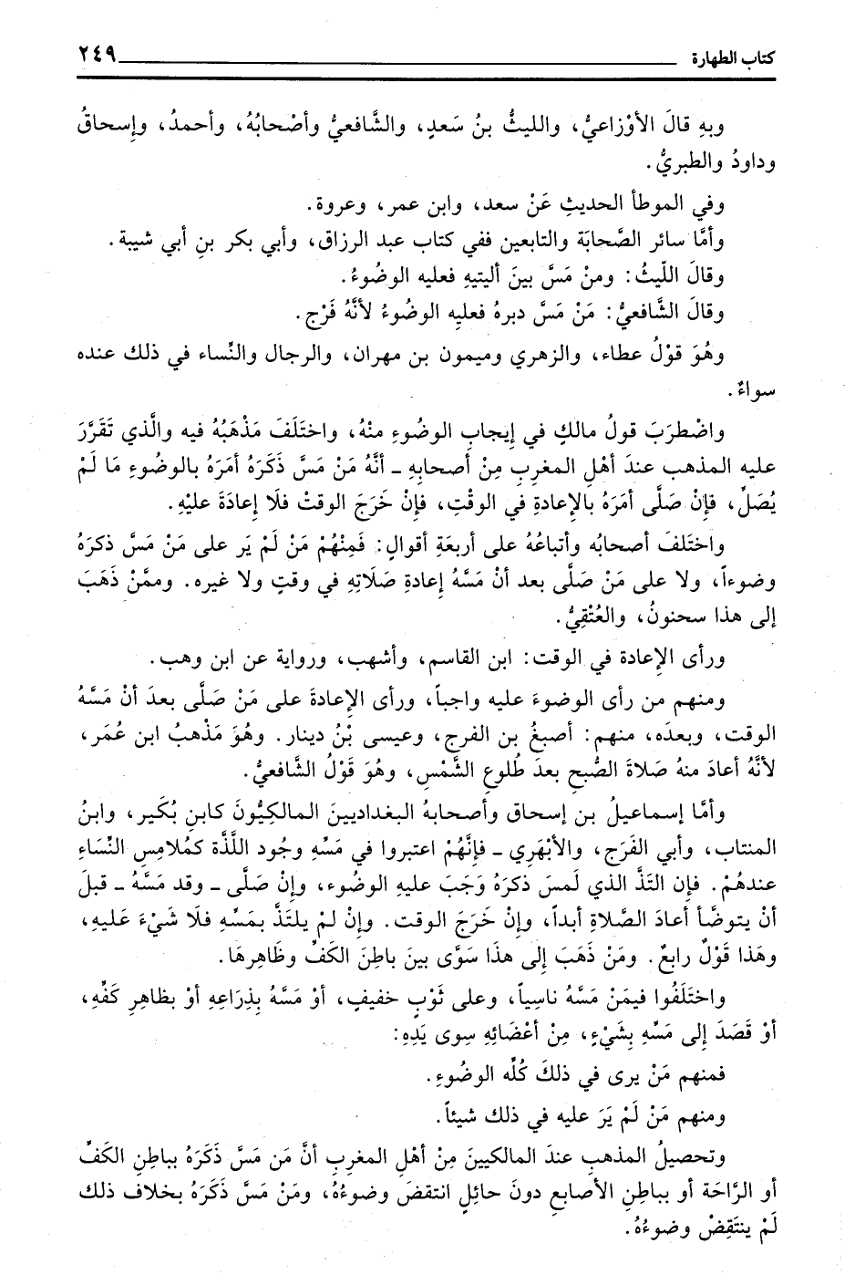 وَاضْطَرَبَ قَوْلُ مَالِكٍ فِي إِيجَابِ الْوُضُوءِ مِنْهُ وَاخْتَلَفَ مَذْهَبُهُ فِيهِ وَالَّذِي تَقَرِّرَ عَلَيْهِ الْمَذْهَبُ عِنْدَ أَهْلِ الْمَغْرِبِ مِنْ أَصْحَابِهِ - أَنَّهُ مَنْ مَسَّ ذَكَرَهُ أَمَرَهُ بِالْوُضُوءِ مَا لَمْ يُصَلِّ فَإِنْ صَلَّى أَمَرَهُ بِالْإِعَادَةِ فِي الْوَقْتِ فَإِنْ خَرَجَ الْوَقْتُ فَلَا إِعَادَةَ عَلَيْهِ وَاخْتَلَفَ أَصْحَابُهُ وَأَتْبَاعُهُ عَلَى أَرْبَعَةِ أَقْوَالٍ فَمِنْهُمْ مَنْ لَمْ يَرَ عَلَى مَنْ مَسَّ ذَكَرَهُ وُضُوءًا وَلَا عَلَى مَنْ صَلَّى بَعْدَ أَنْ مَسَّهُ إِعَادَةَ صَلَاتِهِ فِي وَقْتٍ وَلَا غَيْرِهِ وَمِمَّنْ ذَهَبَ إِلَى هَذَا سُحْنُونُ وَالْعُتْقِيُّ