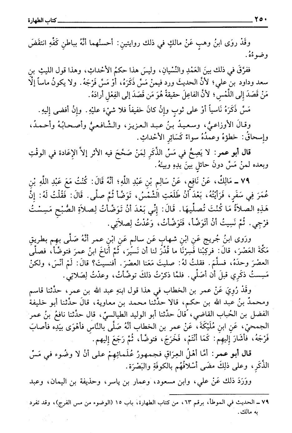 79 - مَالِكٌ عَنْ نَافِعٍ عَنْ سَالِمِ بْنِ عَبْدِ اللَّهِ أَنَّهُ قَالَ كُنْتُ مَعَ عَبْدِ اللَّهِ بْنِ عُمَرَ فِي سَفَرٍ فَرَأَيْتُهُ بَعْدَ أَنْ طَلَعَتِ الشَّمْسُ تَوَضَّأَ ثُمَّ صَلَّى قَالَ فَقُلْتُ لَهُ إِنَّ هذه الصلاة مَا كُنْتَ تُصَلِّيهَا قَالَ إِنِّي بَعْدَ أَنْ تَوَضَّأْتُ لِصَلَاةِ الصُّبْحِ مَسِسْتُ فَرْجِي ثُمَّ نَسِيتُ أن أتوضأ فتوضأت وعدت لصلاتي