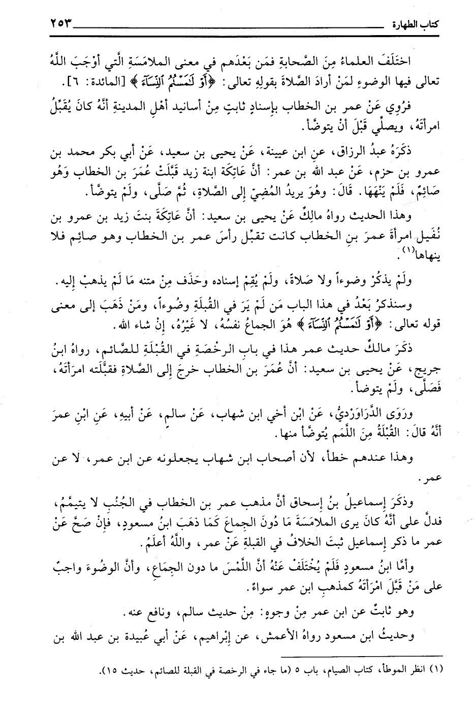 ذكره عبد الرزاق عن بْنُ عُيَيْنَةَ عَنْ يَحْيَى بْنِ سَعِيدٍ عَنْ أَبِي بَكْرٍ مُحَمَّدِ بْنِ عَمْرِو بْنِ حَزْمٍ عَنْ عَبْدِ اللَّهِ بْنِ عُمَرَ أَنَّ عَاتِكَةَ ابْنَةَ زَيْدٍ قَبَّلَتْ عُمَرَ بْنَ الْخَطَّابِ وَهُوَ صَائِمٌ فَلَمْ يَنْهَهَا قَالَ وَهُوَ يُرِيدُ الْمُضِيَّ إِلَى الصَّلَاةِ ثُمَّ صَلَّى وَلَمْ يَتَوَضَّأْ