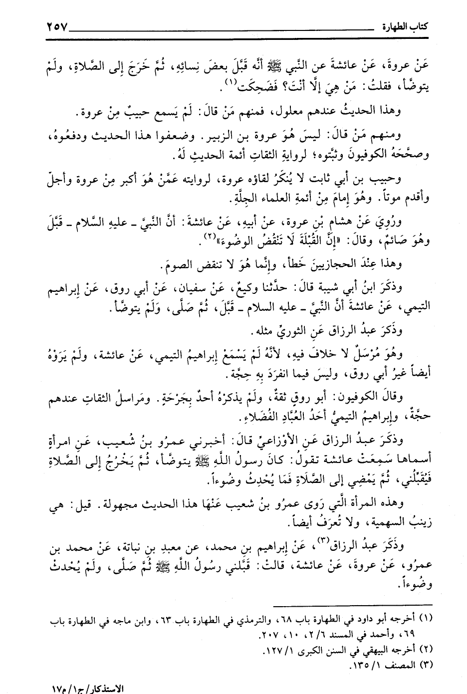 وذكر بْنِ أَبِي شَيْبَةَ قَالَ حَدَّثَنَا وَكِيعٌ عَنْ سُفْيَانَ عَنْ أَبِي رَوْقٍ عَنْ إِبْرَاهِيمَ التَّيْمِيِّ عَنْ عَائِشَةَ أَنَّ النَّبِيَّ - عَلَيْهِ السَّلَامُ - قَبَّلَ ثُمَّ صَلَّى وَلَمْ يَتَوَضَّأْ