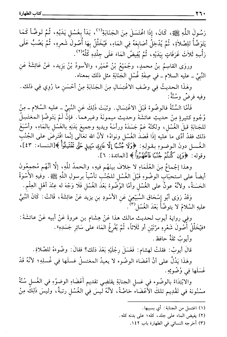 فَأَمَّا السُّنَّةُ فَالْوُضُوءُ قَبْلَ الِاغْتِسَالِ وَثَبَتَ ذَلِكَ عَنِ النَّبِيِّ - عَلَيْهِ السَّلَامُ - مِنْ وُجُوهٍ كَثِيرَةٍ مِنْ حَدِيثِ عَائِشَةَ وَحَدِيثِ مَيْمُونَةَ وَغَيْرِهِمَا فَإِنْ لَمْ يَتَوَضَّأِ الْمُغْتَسِلُ لِلْجَنَابَةِ قَبْلَ الْغُسْلِ وَلَكِنَّهُ عَمَّ جَسَدَهُ وَرَأَسَهُ وَيَدَيْهِ وَجَمِيعَ بَدَنِهِ بِالْغَسْلِ بِالْمَاءِ وَأَسْبَغَ ذَلِكَ فَقَدْ أَدَّى مَا عَلَيْهِ إِذَا قَصَدَ الْغُسْلَ وَنَوَاهُ لِأَنَّ اللَّهَ تَعَالَى إِنَّمَا افْتَرَضَ عَلَى الْجُنُبِ الْغُسْلَ دُونَ الْوُضُوءِ بِقَوْلِهِ (وَلَا جُنُبًا إِلَّا عَابِرِي سَبِيلٍ حَتَّى تَغْتَسِلُوا) النِّسَاءِ 43 وَقَوْلُهُ (وَإِنْ كُنْتُمْ جُنُبًا فَاطَّهَّرُوا) الْمَائِدَةِ 6