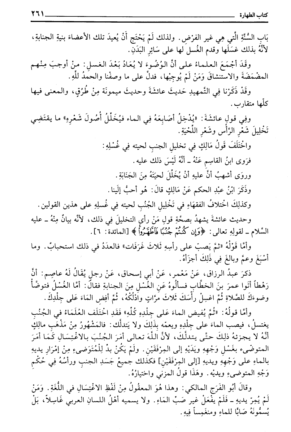 وَأَمَّا قَوْلُهُ ((ثُمَّ يُفِيضُ الْمَاءَ عَلَى جِلْدِهِ كُلِّهِ)) فَقَدِ اخْتَلَفَ الْعُلَمَاءُ فِي الْجُنُبِ يَغْتَسِلُ فَيَصُبُّ الْمَاءَ عَلَى جِلْدِهِ وَيَعُمُّهُ بِذَلِكَ وَلَا يَتَدَلَّكُ فَالْمَشْهُورُ مِنْ مَذْهَبِ مَالِكٍ أَنَّهُ لَا يُجْزِئُهُ ذَلِكَ حَتَّى يَتَدَلَّكَ لِأَنَّ اللَّهَ تَعَالَى أَمَرَ الْجُنُبَ بِالِاغْتِسَالِ كَمَا أَمَرَ الْمُتَوَضِّئَ بِغَسْلِ وَجْهِهِ وَيَدَيْهِ إِلَى الْمِرْفَقَيْنِ وَلَمْ يَكُنْ بُدٌّ لِلْمُتَوَضِّئِ مِنْ إِمْرَارِ يَدَيْهِ بِالْمَاءِ عَلَى وَجْهِهِ وَيَدَيْهِ إِلَى الْمِرْفَقَيْنِ فَكَذَلِكَ جَمِيعُ جَسَدِ الْجُنُبِ وَرَأْسُهُ فِي حُكْمِ وَجْهِ الْمُتَوَضِّئِ وَيَدَيْهِ وَهَذَا قَوْلُ الْمُزَنِيِّ وَاخْتِيَارُهُ