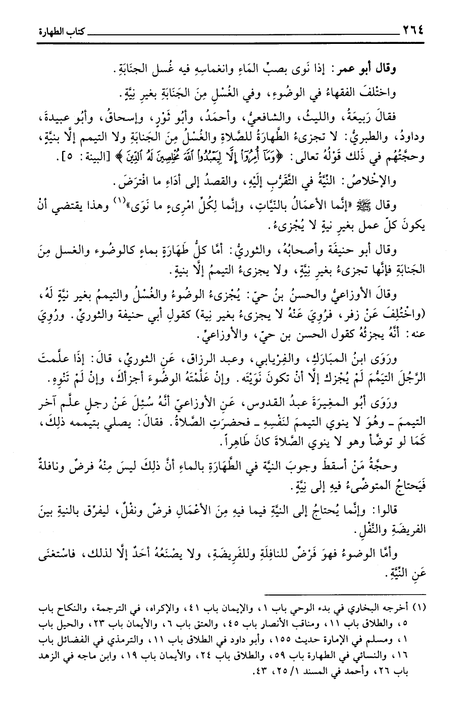 فَقَالَ رَبِيعَةُ وَاللَّيْثُ وَالشَّافِعِيُّ وَأَحْمَدُ وَأَبُو ثَوْرٍ وَإِسْحَاقُ وَأَبُو عُبَيْدَةَ وَدَاوُدُ وَالطَّبَرِيُّ لَا تُجْزِئُ الطَّهَارَةُ لِلصَّلَاةِ وَالْغُسْلُ مِنَ الْجَنَابَةِ وَلَا التَّيَمُّمُ إِلَّا بِنِيَّةٍ وَحُجَّتُهُمْ فِي ذَلِكَ قَوْلُهُ تَعَالَى (وَمَا أُمِرُوا إِلَّا لِيَعْبُدُوا اللَّهَ مُخْلِصِينَ لَهُ الدين) الْبَيِّنَةِ 5