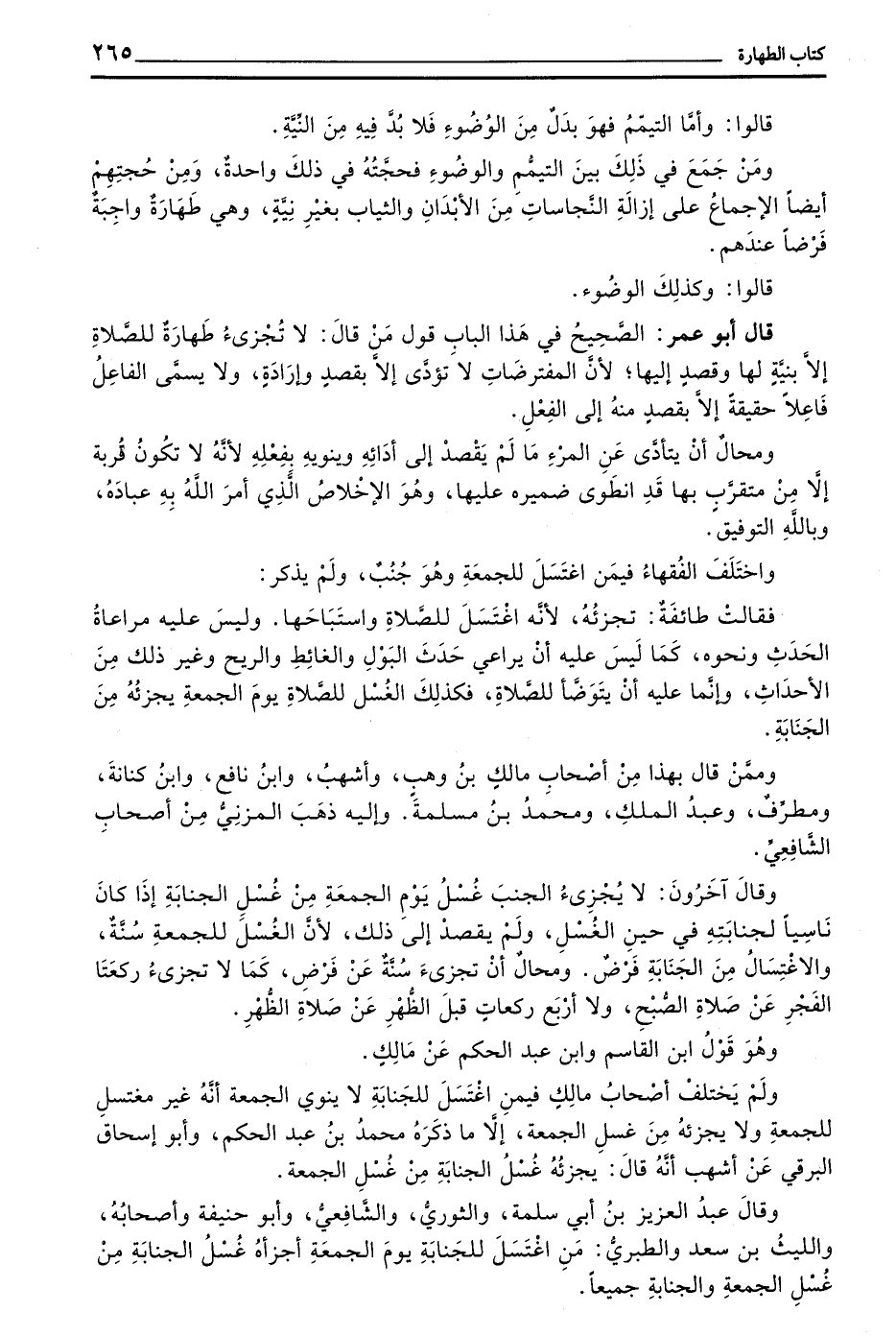 قَالَ أَبُو عُمَرَ الصَّحِيحُ فِي هَذَا الْبَابِ قَوْلُ مَنْ قَالَ لَا تُجْزِئُ طَهَارَةٌ لِلصَّلَاةِ إِلَّا بِنِيَّةٍ لَهَا وَقَصْدٍ إِلَيْهَا لِأَنَّ الْمُفْتَرَضَاتِ لَا تُؤَدَّى إِلَّا بِقَصْدٍ وَإِرَادَةٍ وَلَا يُسَمَّى الْفَاعِلُ فَاعِلًا حَقِيقَةً إِلَّا بِقَصْدٍ مِنْهُ إِلَى الْفِعْلِ