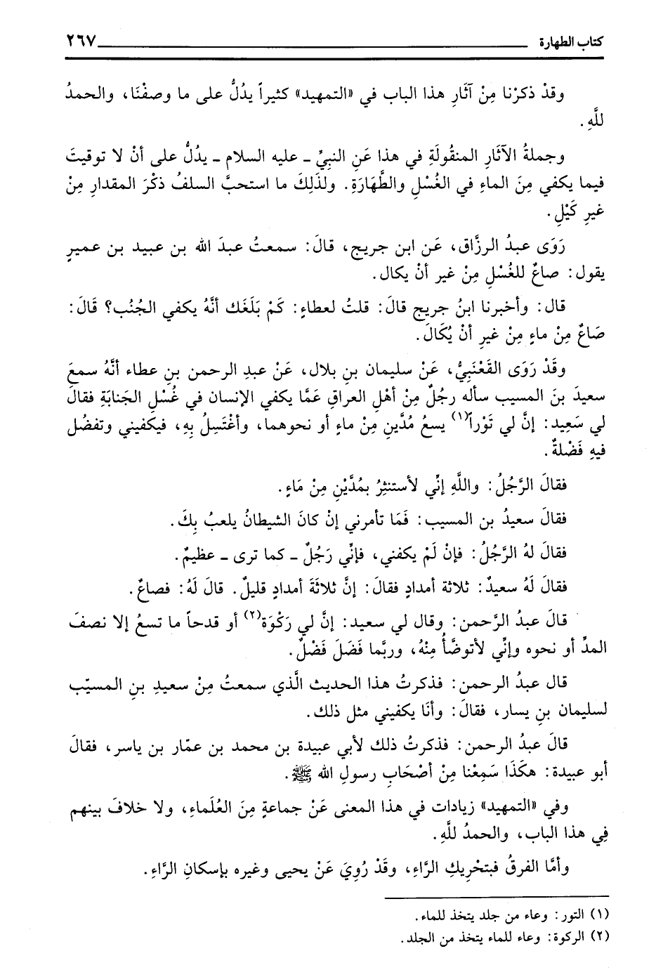 وَجُمْلَةُ الْآثَارِ الْمَنْقُولَةِ فِي هَذَا عَنِ النَّبِيِّ - عَلَيْهِ السَّلَامُ - يَدُلُّ عَلَى أَنْ لَا تَوْقِيتَ فِيمَا يَكْفِي مِنَ الْمَاءِ فِي الْغُسْلِ وَالطَّهَارَةِ وَلِذَلِكَ مَا اسْتَحَبَّ السَّلَفُ ذِكْرَ الْمِقْدَارِ مِنْ غَيْرِ كَيْلٍ