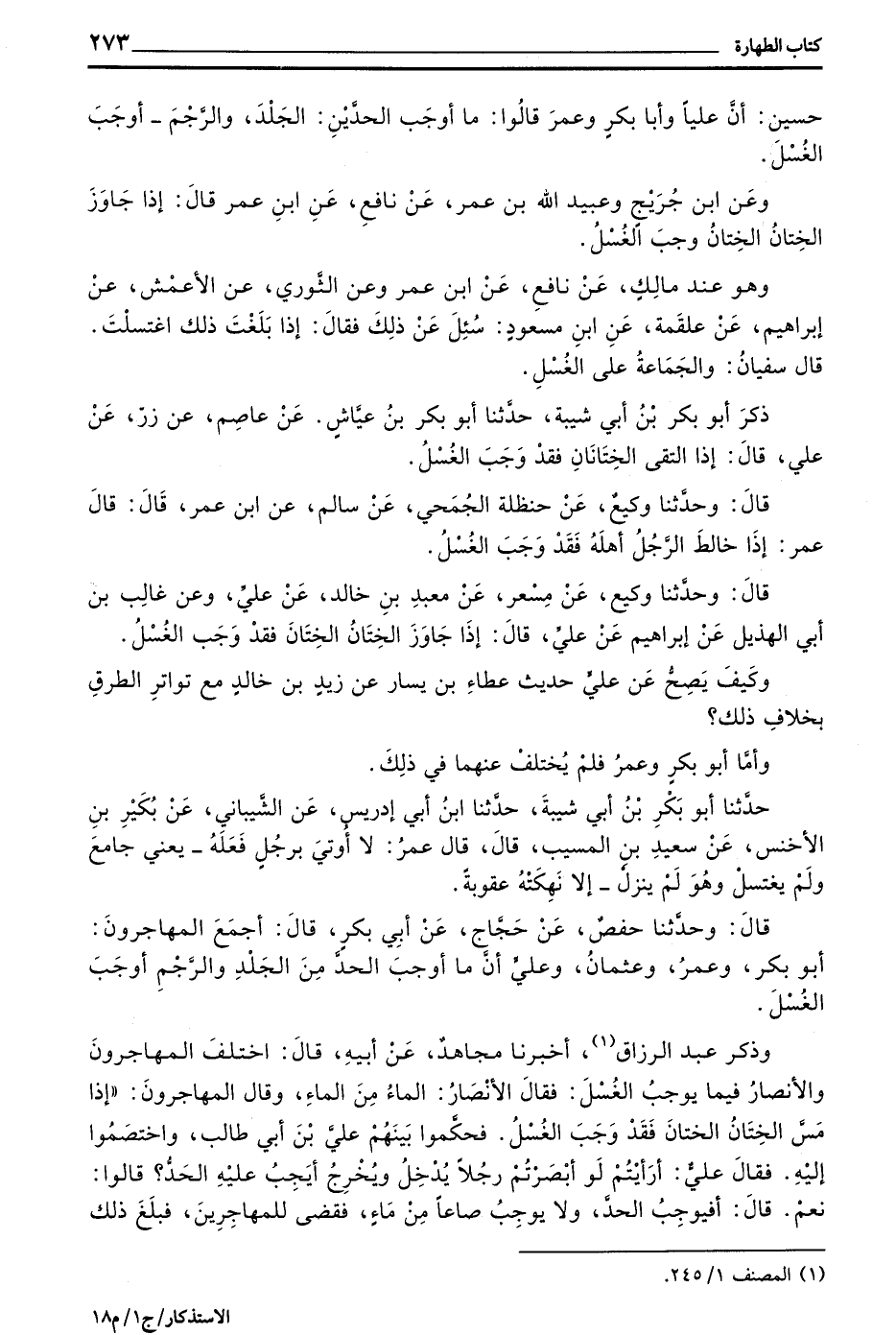 وَذَكَرَ عَبْدُ الرَّزَّاقِ أَخْبَرَنَا مُجَاهِدٌ عَنْ أَبِيهِ قَالَ اخْتَلَفَ الْمُهَاجِرُونَ وَالْأَنْصَارُ فِيمَا يُوجِبُ الْغُسْلَ فَقَالَ الْأَنْصَارُ الْمَاءُ مِنَ الْمَاءِ وَقَالَ الْمُهَاجِرُونَ ((إِذَا مَسَّ الْخِتَانُ الْخِتَانَ فَقَدْ وَجَبَ الْغُسْلُ فَحَكَّمُوا بَيْنَهُمْ عَلِيَّ بْنَ أَبِي طَالِبٍ وَاخْتَصَمُوا إِلَيْهِ فَقَالَ عَلِيٌّ أَرَأَيْتُمْ لَوْ أَبْصَرْتُمْ رَجُلًا يُدْخِلُ وَيُخْرِجُ أَيَجِبُ عَلَيْهِ الْحَدُّ قَالُوا نَعَمْ قَالَ أَفَيُوجِبُ الْحَدَّ وَلَا يُوجِبُ صَاعًا مِنْ مَاءٍ فَقَضَى لِلْمُهَاجِرِينَ فَبَلَغَ ذَلِكَ