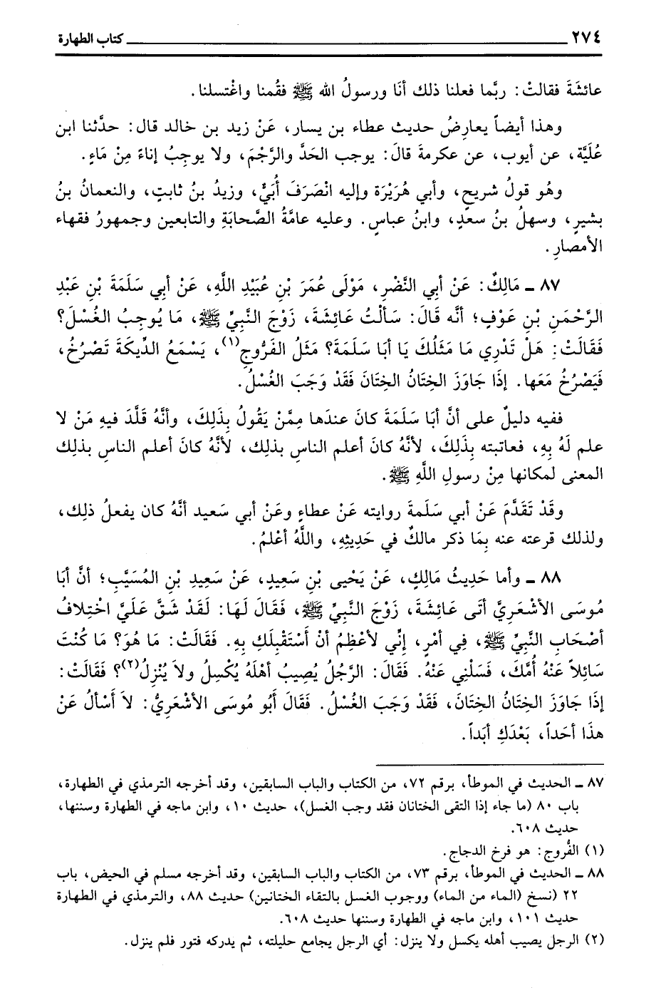 87 - مَالِكٌ عَنْ أَبِي النَّضْرِ مَوْلَى عُمَرَ بْنِ عُبَيْدِ اللَّهِ عَنْ أَبِي سَلَمَةَ بْنِ عَبْدِ الرَّحْمَنِ بْنِ عَوْفٍ أَنَّهُ قَالَ سَأَلْتُ عائشة زوج النبي صلى الله عليه وسلم مَا يُوجِبُ الْغُسْلَ فَقَالَتْ هَلْ تَدْرِي مَا مَثَلُكَ يَا أَبَا سَلَمَةَ مَثَلُ الْفَرُّوجِ يَسْمَعُ الدِّيَكَةَ تَصْرُخُ فَيَصْرُخُ مَعَهَا إِذَا جَاوَزَ الْخِتَانُ الختان فقد وجب الغسل
