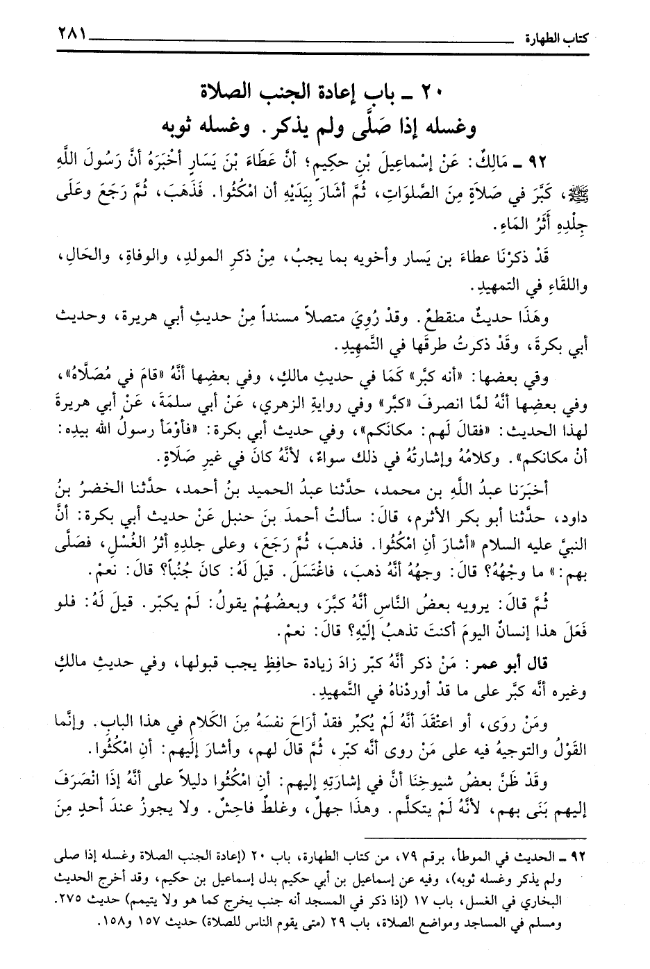 92 - مَالِكٌ عَنْ إِسْمَاعِيلَ بْنِ حَكِيمٍ أَنَّ عَطَاءَ بْنَ يَسَارٍ أَخْبَرَهُ أَنَّ رَسُولَ اللَّهِ صَلَّى اللَّهُ عَلَيْهِ وسلم كَبَّرَ فِي صَلَاةٍ مِنَ الصَّلَوَاتِ ثُمَّ أَشَارَ بيديه أن امكثوا فذهب ثم رجع على جِلْدِهِ أَثَرُ الْمَاءِ