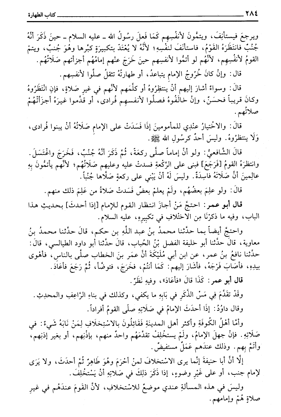 وَيَرْجِعَ فَيَسْتَأْنِفَ وَيُتِمُّونَ لِأَنْفُسِهِمْ كَمَا فَعَلَ رَسُولُ اللَّهِ - عَلَيْهِ السَّلَامُ - حِينَ ذَكَرَ أَنَّهُ جُنُبٌ فَانْتَظَرَهُ الْقَوْمُ فَاسْتَأْنَفَ لِنَفْسِهِ لِأَنَّهُ لَا يُعْتَدُّ بِتَكْبِيرَةٍ كَبَّرَهَا وَهُوَ جُنُبٌ وَيُتِمُّ الْقَوْمُ لِأَنْفُسِهِمْ لِأَنَّهُمْ لَوْ أَتَمُّوا لِأَنْفُسِهِمْ حِينَ خَرَجَ عَنْهُمْ إِمَامُهُمْ أَجْزَأَتْهُمْ صَلَاتُهُمْ