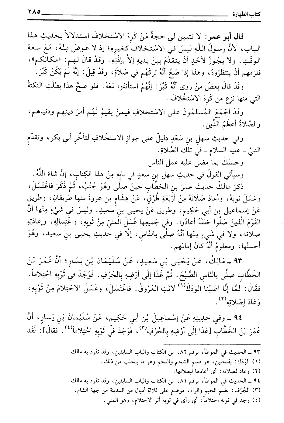 93 - مَالِكٌ عَنْ يَحْيَى بْنِ سَعِيدٍ عَنْ سُلَيْمَانَ بْنِ يَسَارٍ أَنَّ عُمَرَ بْنَ الْخَطَّابِ صَلَّى بِالنَّاسِ الصُّبْحَ ثُمَّ غَدَا إِلَى أَرْضِهِ بِالْجُرُفِ فَوَجَدَ فِي ثَوْبِهِ احتلاما فقال لما إنا أَصَبْنَا الْوَدَكَ لَانَتِ الْعُرُوقُ فَاغْتَسَلَ وَغَسَلَ الِاحْتِلَامَ مِنْ ثَوْبِهِ وَعَادَ لِصَلَاتِهِ