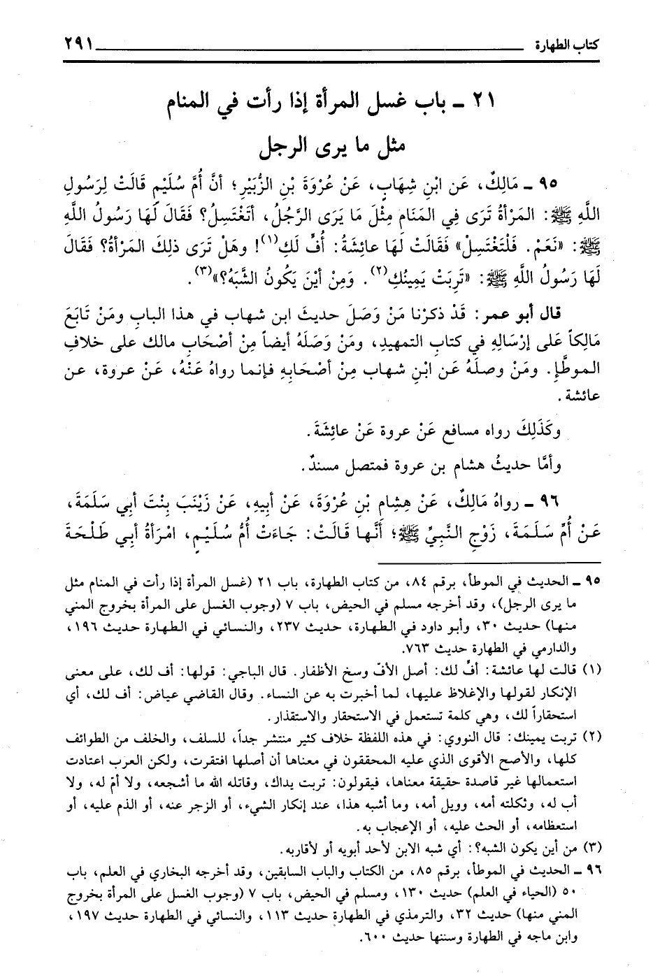 95 - مالك عن بن شِهَابٍ عَنْ عُرْوَةَ بْنِ الزُّبَيْرِ أَنَّ أُمَّ سُلَيْمٍ قَالَتْ لِرَسُولِ اللَّهِ صَلَّى اللَّهُ عَلَيْهِ وَسَلَّمَ الْمَرْأَةُ تَرَى فِي الْمَنَامِ مِثْلَ مَا يَرَى الرَّجُلُ أَتَغْتَسِلُ فَقَالَ لَهَا رَسُولُ اللَّهِ صَلَّى اللَّهُ عَلَيْهِ وَسَلَّمَ ((نَعَمْ فَلْتَغْتَسِلْ)) فَقَالَتْ لَهَا عَائِشَةُ أُفٍّ لَكِ! وَهَلْ تَرَى ذَلِكَ الْمَرْأَةُ فَقَالَ لَهَا رَسُولُ اللَّهِ صَلَّى اللَّهُ عَلَيْهِ وَسَلَّمَ ((تَرِبَتْ يَمِينُكِ (2) وَمِنْ أَيْنَ يَكُونُ الشَّبَهُ))