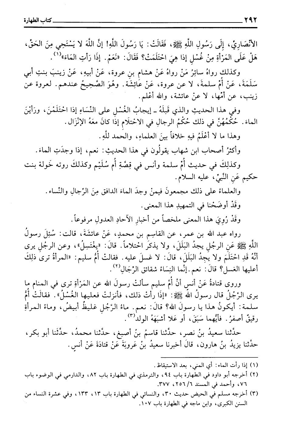 رَوَاهُ عبد الله بن عمر عَنِ الْقَاسِمِ بْنِ مُحَمَّدٍ عَنْ عَائِشَةَ قَالَتْ سُئِلَ رَسُولُ اللَّهِ صَلَّى اللَّهُ عَلَيْهِ وَسَلَّمَ عَنِ الرَّجُلِ يَجِدُ الْبَلَلَ وَلَا يَذْكُرُ احْتِلَامًا قَالَ ((يَغْتَسِلُ)) وَعَنِ الرَّجُلِ يَرَى أَنَّهُ قَدِ احْتَلَمَ وَلَا يَجِدُ الْبَلَلَ قَالَ لَا غُسْلَ عَلَيْهِ فَقَالَتْ أُمُّ سُلَيْمٍ ((الْمَرْأَةُ تَرَى ذَلِكَ أَعَلَيْهَا الْغُسْلُ قَالَ نَعَمْ إِنَّمَا النِّسَاءُ شَقَائِقُ الرِّجَالِ (2)