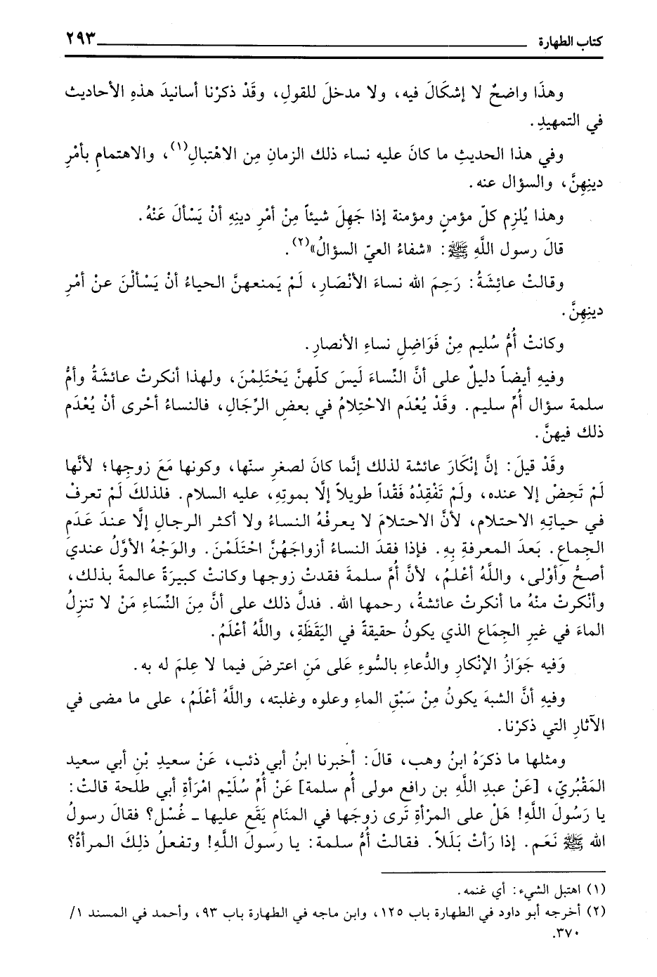 وَقَدْ قِيلَ إِنَّ إِنْكَارَ عَائِشَةَ لِذَلِكَ إِنَّمَا كَانَ لِصِغَرِ سِنِّهَا وَكَوْنِهَا مَعَ زَوْجِهَا لِأَنَّهَا لَمْ تَحِضْ إِلَّا عِنْدَهُ وَلَمْ تَفْقِدْهُ فَقْدًا طَوِيلًا إِلَّا بِمَوْتِهِ عَلَيْهِ السَّلَامُ فَلِذَلِكَ لَمْ تَعْرِفْ فِي حَيَاتِهِ الِاحْتِلَامَ لِأَنَّ الِاحْتِلَامَ لَا يَعْرِفُهُ النِّسَاءُ وَلَا أَكْثَرُ الرِّجَالِ إِلَّا عِنْدَ عَدَمِ الْجِمَاعِ بَعْدَ الْمَعْرِفَةِ بِهِ فَإِذَا فَقَدَ النِّسَاءُ أَزْوَاجَهُنَّ احْتَلَمْنَ وَالْوَجْهُ الْأَوَّلُ عِنْدِي أَصَحُّ وَأَوْلَى وَاللَّهُ أَعْلَمُ لِأَنَّ أُمَّ سَلَمَةَ فَقَدَتْ زَوْجَهَا وَكَانَتْ كَبِيرَةً عَالِمَةً بِذَلِكَ وَأَنْكَرَتْ مِنْهُ مَا أَنْكَرَتْ عَائِشَةُ رَحِمَهَا اللَّهُ فَدَلَّ ذَلِكَ عَلَى أَنَّ مِنَ النِّسَاءِ مَنْ لَا تُنْزِلُ الْمَاءَ فِي غَيْرِ الْجِمَاعِ الَّذِي يَكُونُ حَقِيقَةً فِي الْيَقَظَةِ وَاللَّهُ أَعْلَمُ