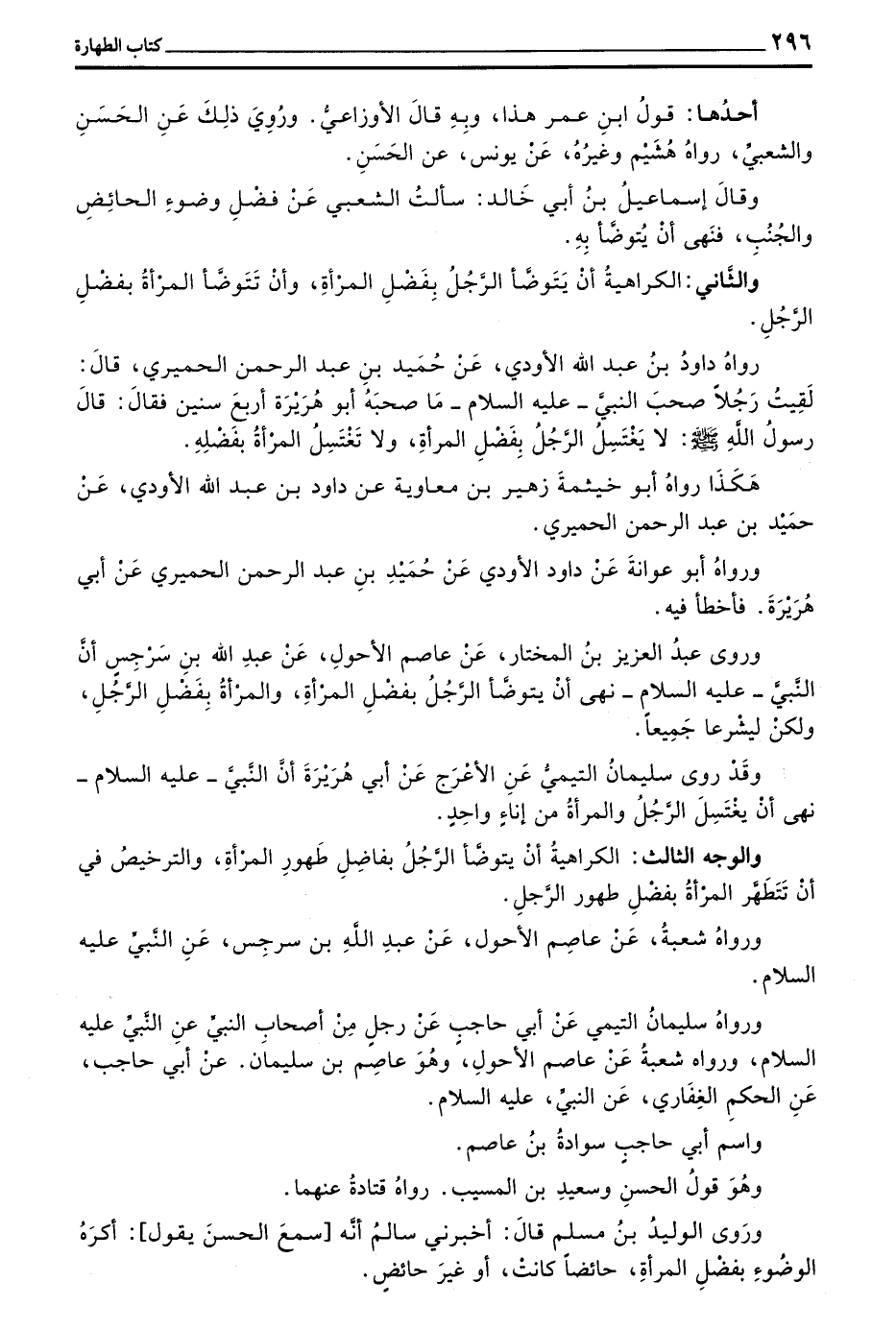 رَوَاهُ دَاوُدُ بْنُ عَبْدِ الله الأودي عن حميد بن عبد الرحمن الْحِمْيَرِيِّ قَالَ لَقِيتُ رَجُلًا صَحِبَ النَّبِيَّ - عَلَيْهِ السَّلَامُ - مَا صَحِبَهُ أَبُو هُرَيْرَةَ أَرْبَعَ سِنِينَ فَقَالَ قَالَ رَسُولُ اللَّهِ صَلَّى اللَّهُ عَلَيْهِ وَسَلَّمَ لَا يَغْتَسِلُ الرَّجُلُ بِفَضْلِ الْمَرْأَةِ وَلَا تَغْتَسِلُ الْمَرْأَةُ بِفَضْلِهِ