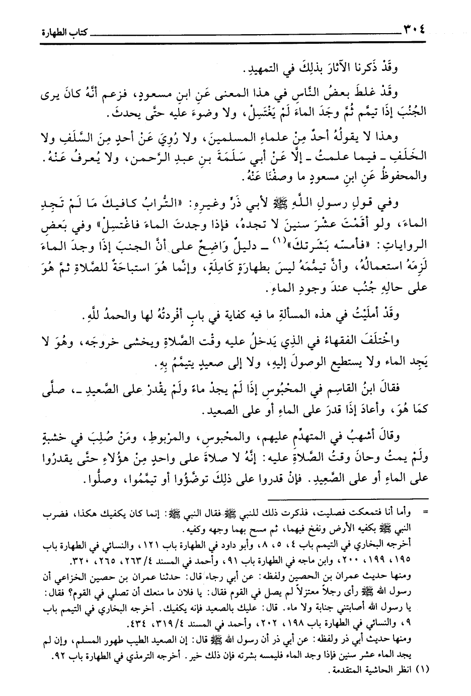وَفِي قَوْلِ رَسُولِ اللَّهِ صَلَّى اللَّهُ عَلَيْهِ وَسَلَّمَ لِأَبِي ذَرٍّ وَغَيْرِهِ ((التُّرَابُ كَافِيكَ مَا لَمْ تَجِدِ الْمَاءَ وَلَوْ أَقَمْتَ عَشْرَ سِنِينَ لَا تَجِدُهُ فَإِذَا وَجَدْتَ الْمَاءَ فَاغْتَسِلْ)) وَفِي بَعْضِ الرِّوَايَاتِ ((فَأَمِسَّهُ بَشَرَتَكَ)) - دَلِيلٌ وَاضِحٌ عَلَى أَنَّ الْجُنُبَ إِذَا وَجَدَ الْمَاءَ لَزِمَهُ اسْتِعْمَالُهُ وَأَنَّ تَيَمُّمَهُ لَيْسَ بِطَهَارَةٍ كَامِلَةٍ وَإِنَّمَا هُوَ اسْتِبَاحَةٌ لِلصَّلَاةِ ثُمَّ هُوَ عَلَى حَالِهِ جُنُبٌ عِنْدَ وُجُودِ الْمَاءِ