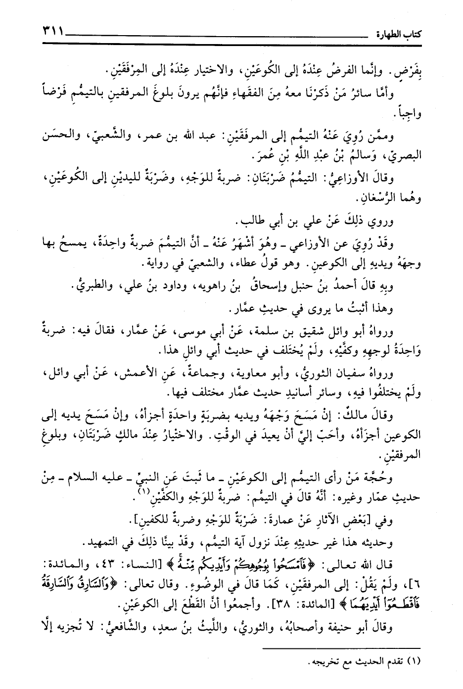 قَالَ اللَّهُ تَعَالَى (فَامْسَحُوا بِوُجُوهِكُمْ وأيديكم منه) النساء 43 والمائدة 6 وَلَمْ يَقُلْ إِلَى الْمِرْفَقَيْنِ كَمَا قَالَ فِي الْوُضُوءِ وَقَالَ تَعَالَى (وَالسَّارِقُ وَالسَّارِقَةُ فَاقْطَعُوا أَيْدِيَهُمَا) الْمَائِدَةِ 38 وَأَجْمَعُوا أَنَّ الْقَطْعَ إِلَى الْكُوعَيْنِ