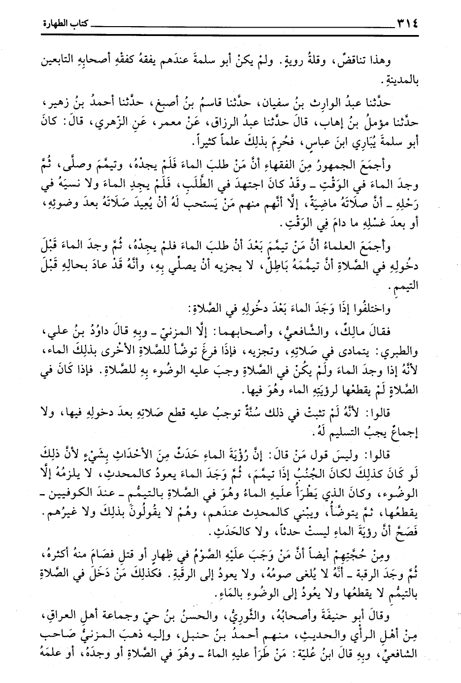وَقَالَ أَبُو حَنِيفَةَ وَأَصْحَابُهُ وَالثَّوْرِيُّ وَالْحَسَنُ بْنُ حَيٍّ وَجَمَاعَةُ أَهْلِ الْعِرَاقِ مِنْ أَهْلِ الرَّأْيِ وَالْحَدِيثِ مِنْهُمْ أَحْمَدُ بْنُ حَنْبَلٍ وَإِلَيْهِ ذَهَبَ الْمُزَنِيُّ صاحب الشافعي وبه قال بن عُلَيَّةَ مَنْ طَرَأَ عَلَيْهِ الْمَاءُ - وَهُوَ فِي الصَّلَاةِ أَوْ وَجَدَهُ أَوْ عَلِمَهُ